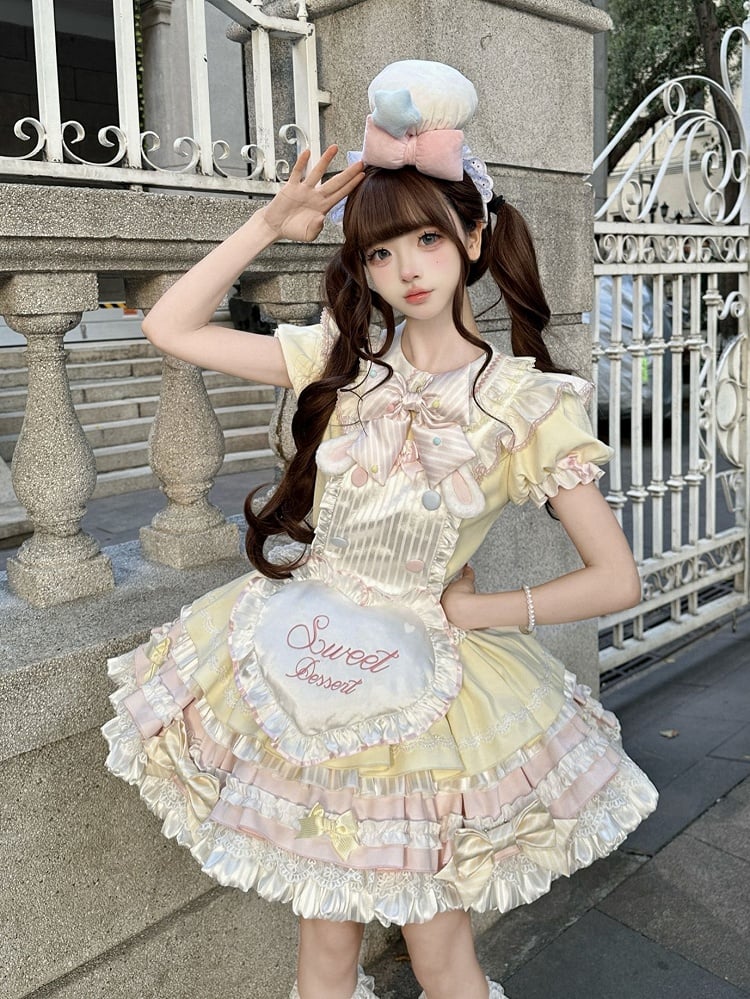 Gelbes und rosa Lolita-Kleid mit Puffärmeln und süßem Häschenmotiv