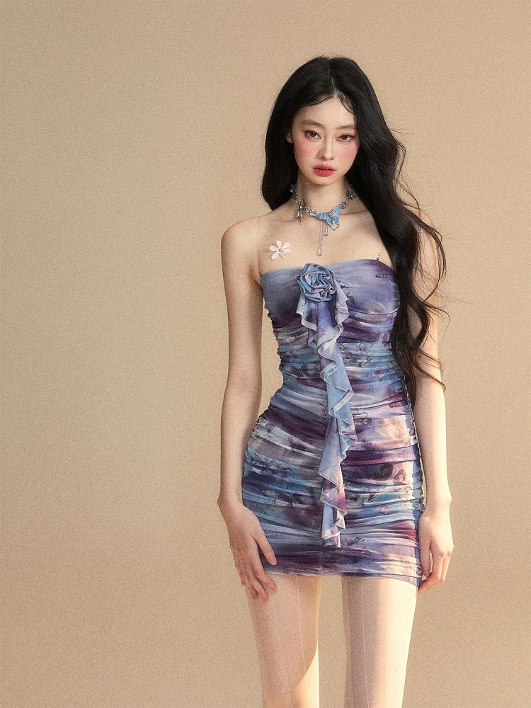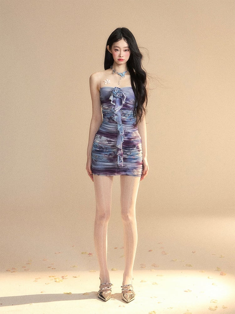 Glamouröses Mini-Unterkleid mit blauem Ölgemälde-Print und Raffung