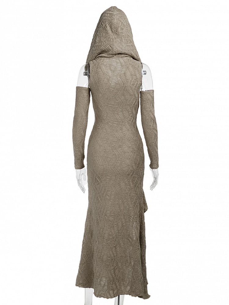 Khaki Wasteland Sleeveless Hooded Mermaid Dress with Thigh Slit & Detachable Cuffs