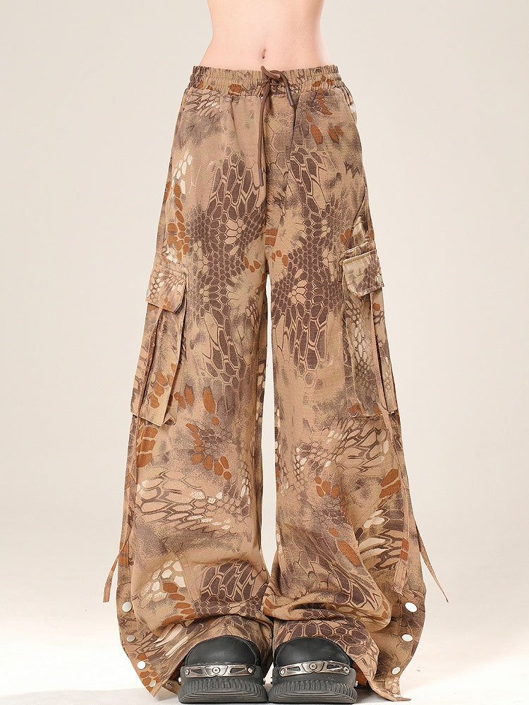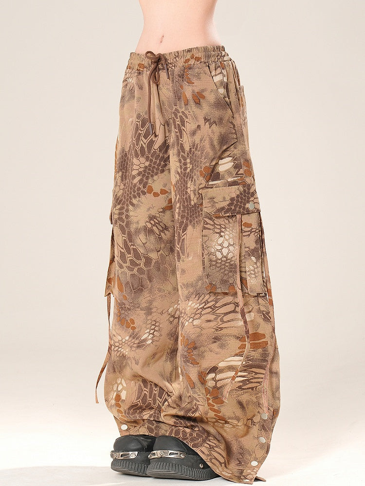 Braune Cargohose mit weitem Bein und Schlangenschuppen-Print