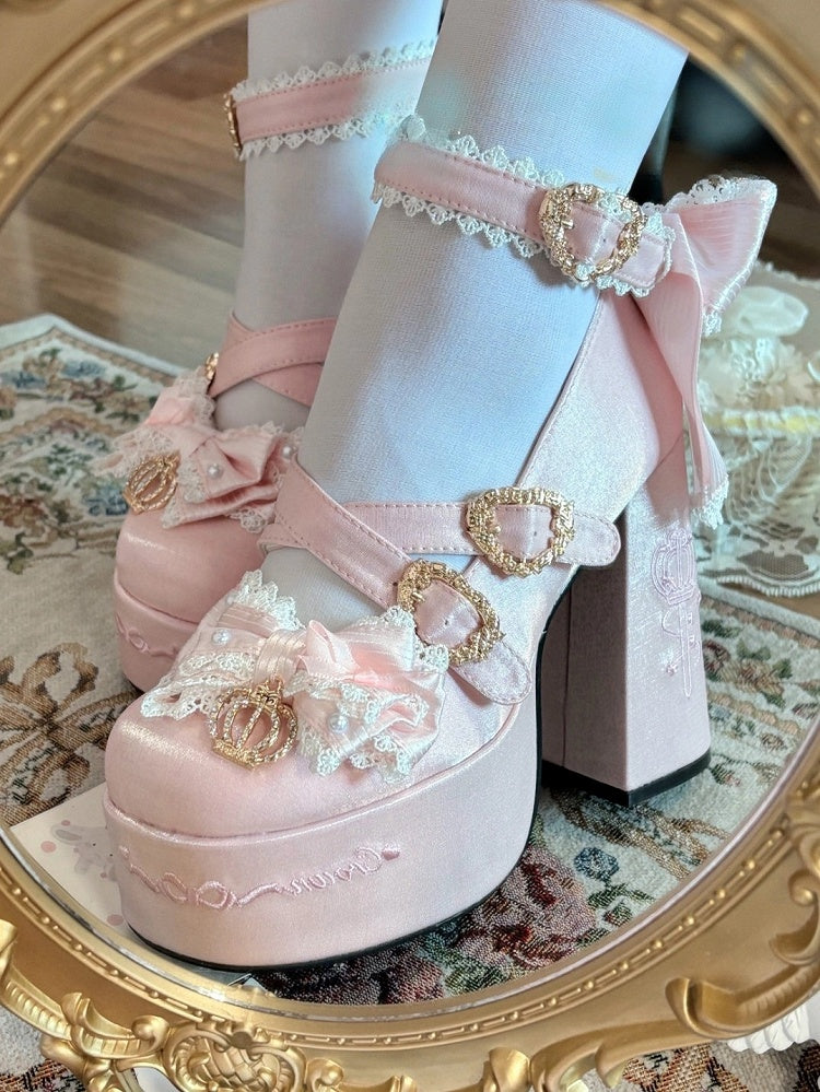Snap Platform Detachable Chain Heel Heels Striped - Lolita Closure Pink Heart Charm Sweet Block Beaded Back Bows High