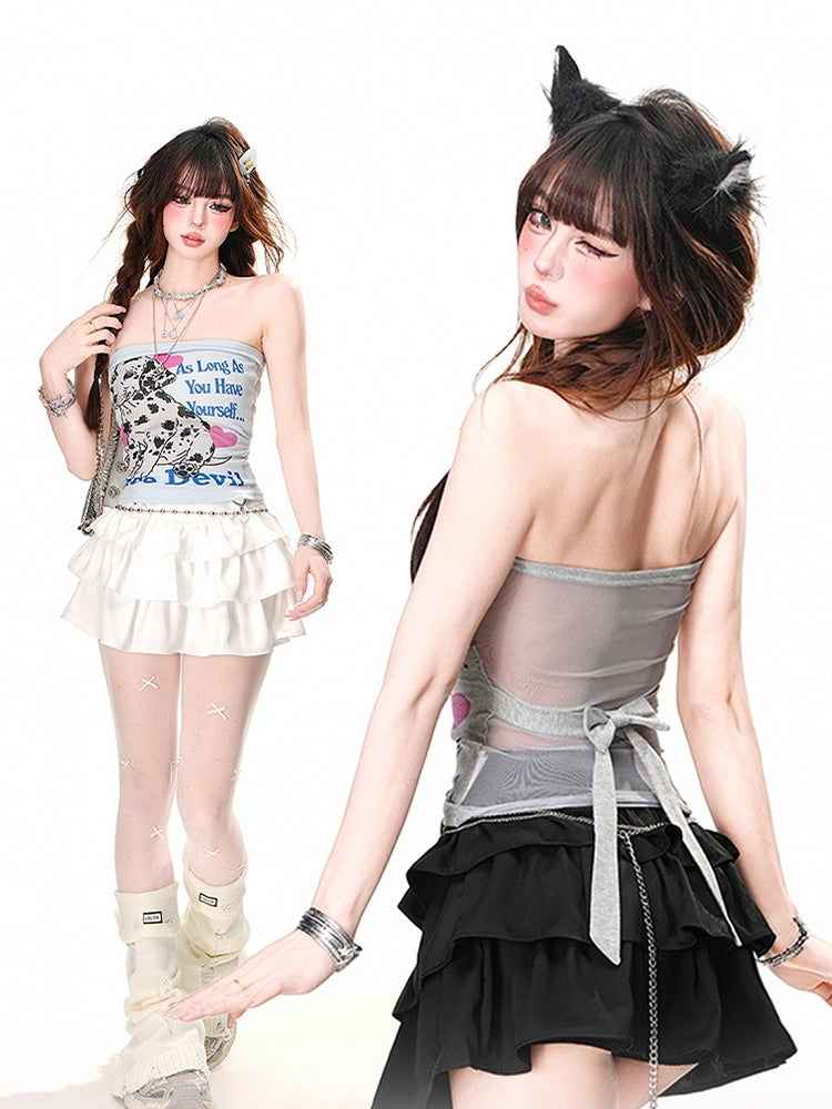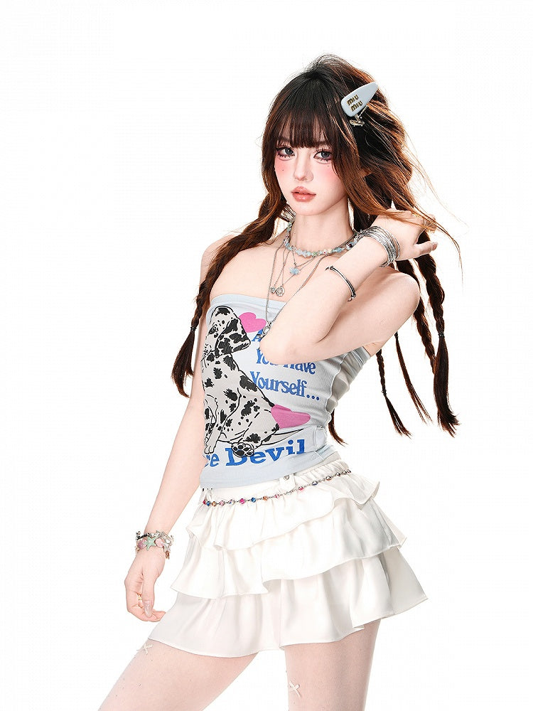 Glamouröses trägerloses Top mit gepunktetem Hundedruck und Patchwork-Design auf der Rückseite in Grau/Blau