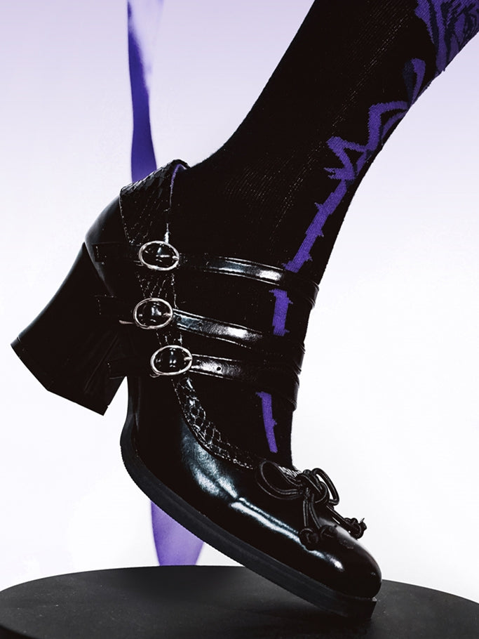 Schwarze Gothic-Lolita-Pumps mit quadratischer Zehenpartie und 6,5 cm Blockabsatz – Knotenschleifen-Akzent, Schlangenhautmuster und 3 Schnallen