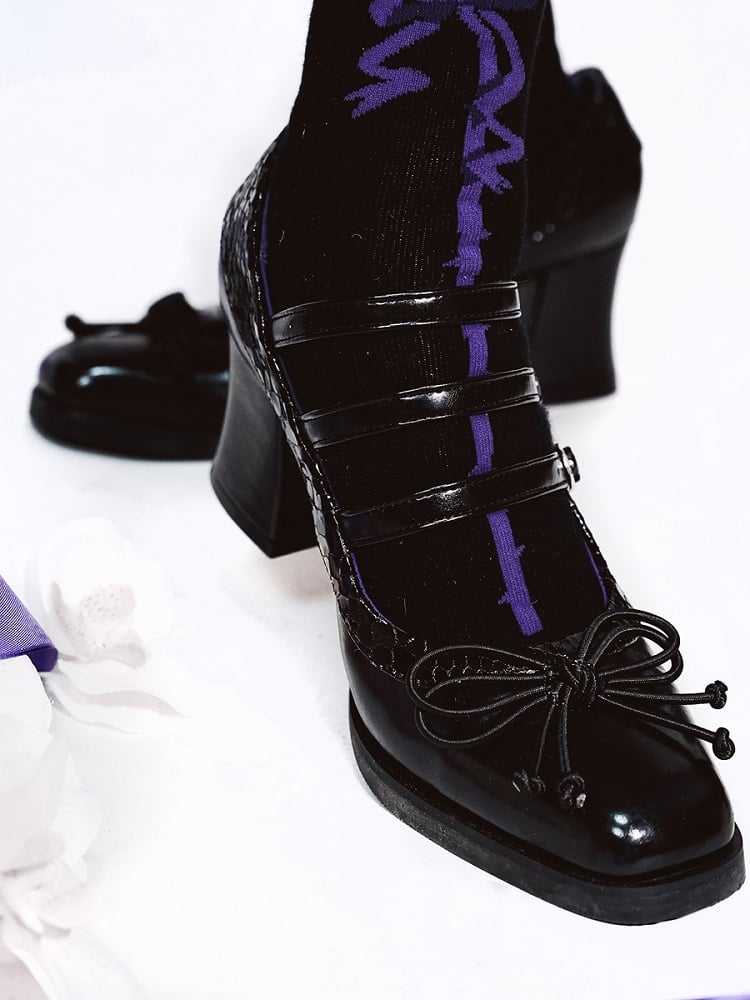 Quadratische Akzentzehe Gothic - 6,5 cm Absätze Schleife PU Schwarz Lolita Block Geknotet