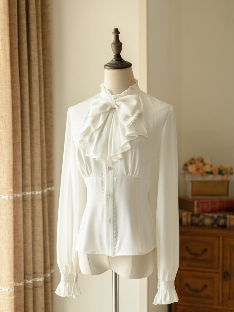 Holen Sie sich einen süßen Look mit unserem weißen Retro-Hemd mit Stehkragen und langen Ärmeln. Der Stehkragen verleiht einen Hauch von Eleganz, während die langen Ärmel für Schutz sorgen. Perfekt für ein Outfit im Vintage-Stil.