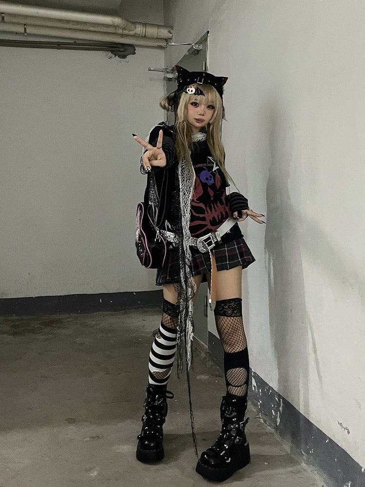 Punkrock-Zweiteiler und Top aus schwarzer Skelett-Baumwolle mit Sternendruck