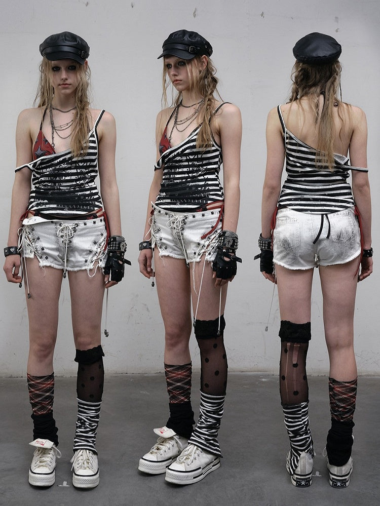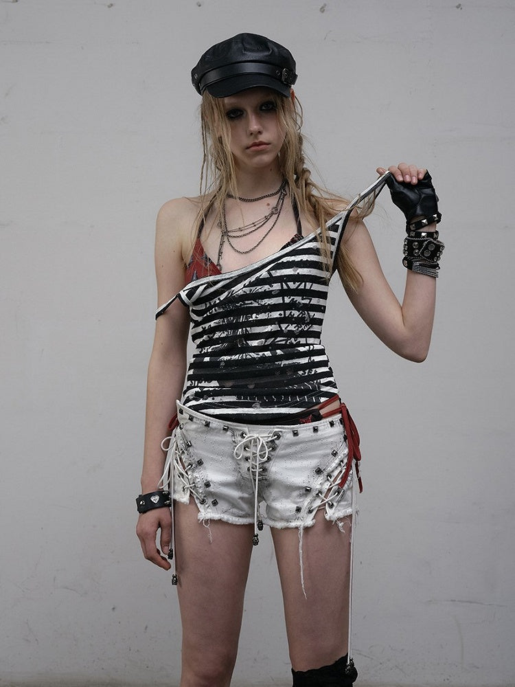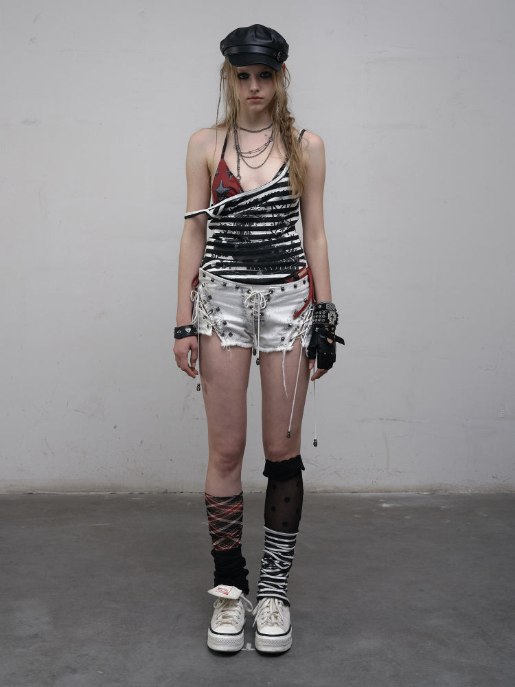Red & Black Star-Print Punk Swimsuit Bikini Set with Plaid & Tie Details
