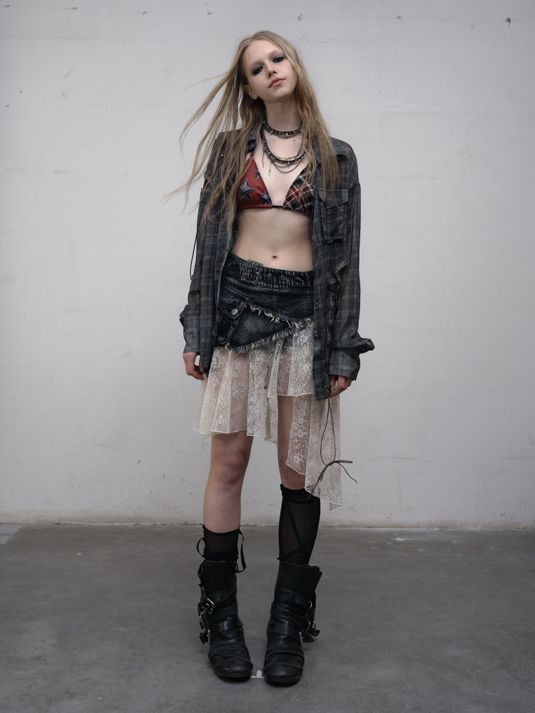 Star-Print Swimsuit Black Bikini with Punk Tie Set Plaid Details Red