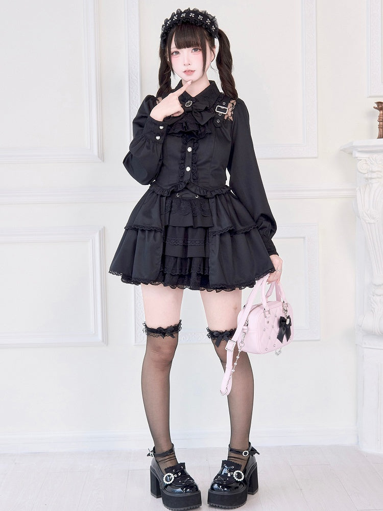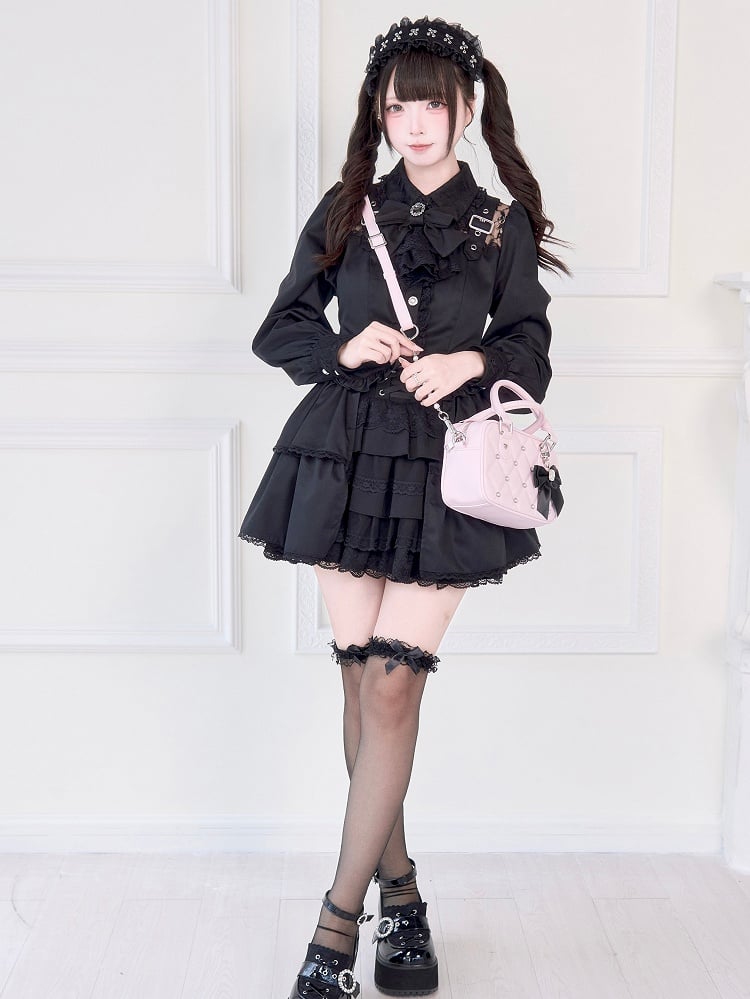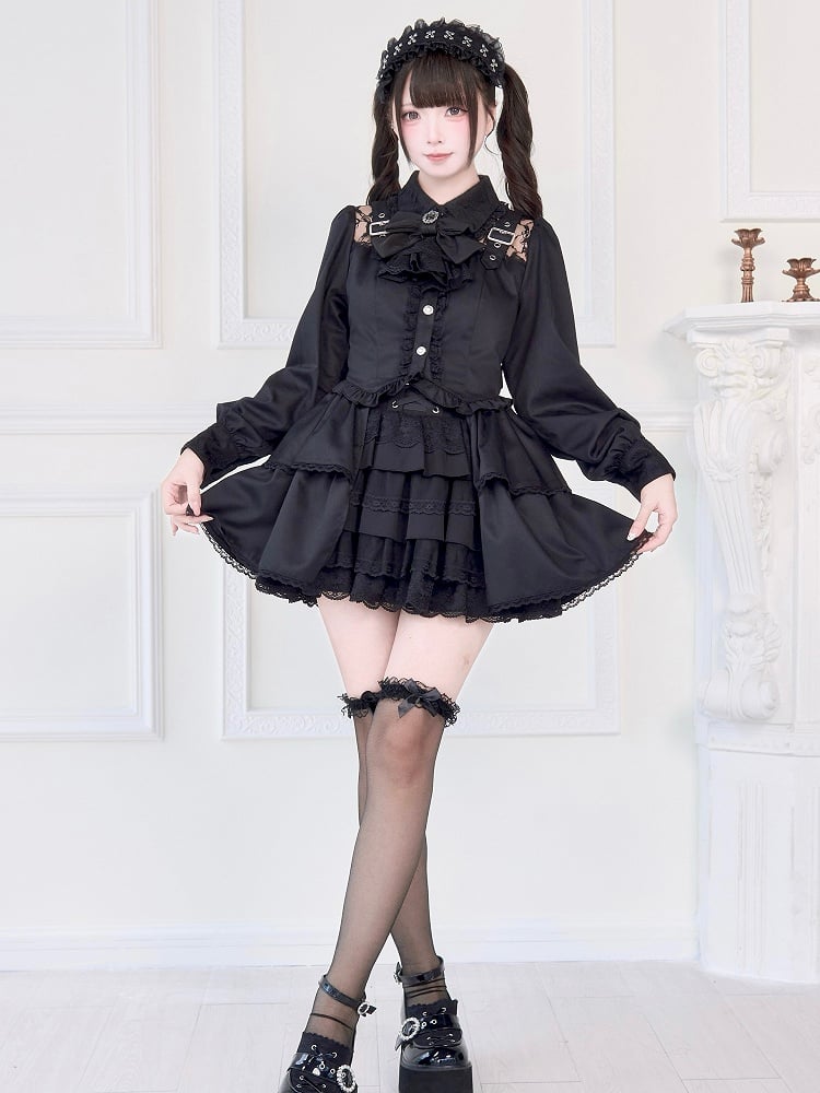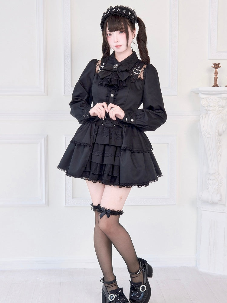 Jirai Kei – Schwarze Bluse mit Illusionsausschnitt, Schnallenträgern und dekorativer Schleifenbrosche