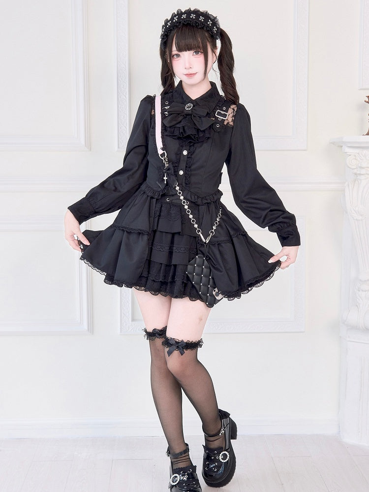 Trägerbluse Schwarz Dekorativer Ausschnitt und Schnalle Illusion Jirai Kei Brosche mit Schleife