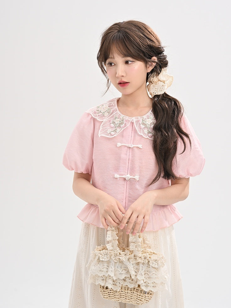 Erdbeerstickerei Rosa Blütenblattförmiger Kragen Puffärmel Blusenausschnitt Cheongsam