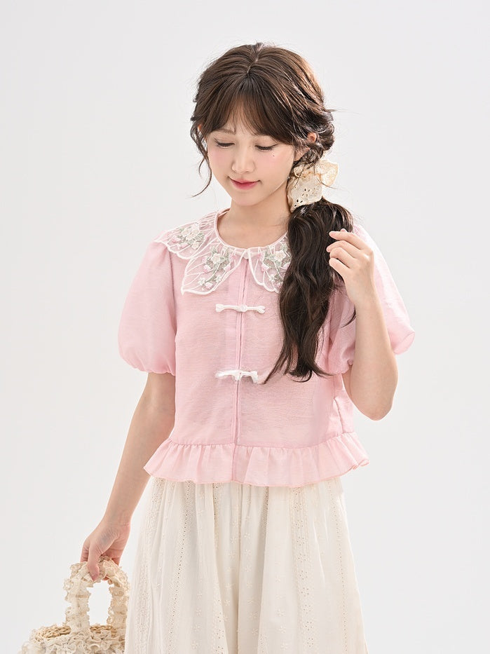 Rosa Cheongsam-Bluse mit blütenblattförmigem Kragen, Puffärmeln und Erdbeerstickerei am Ausschnitt