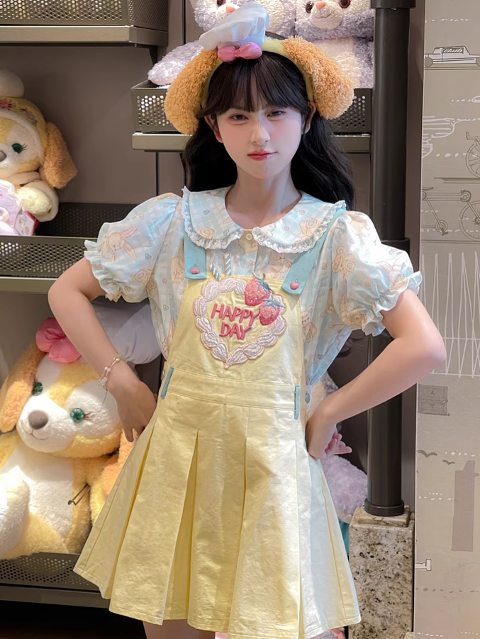 Süßes Overallkleid mit Erdbeerstickerei und Kellerfalten in Gelb