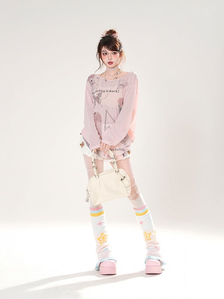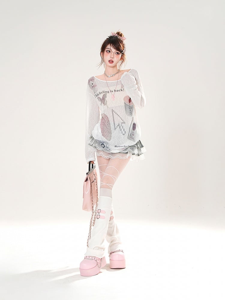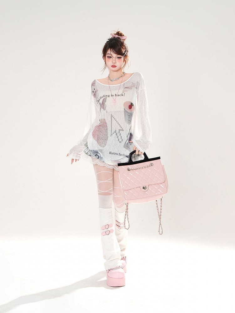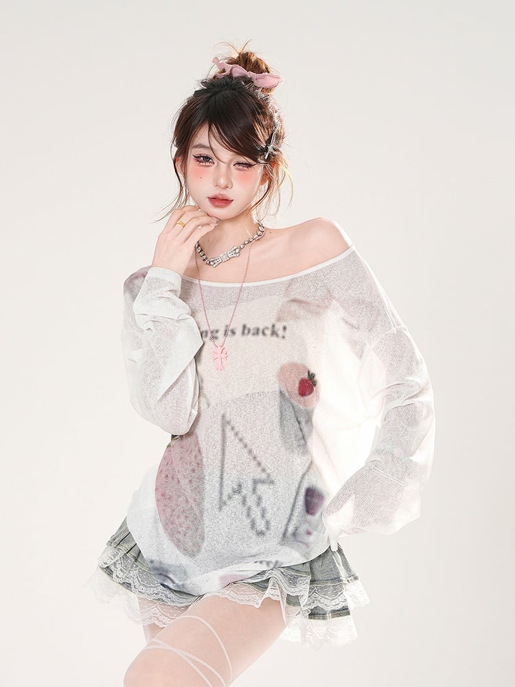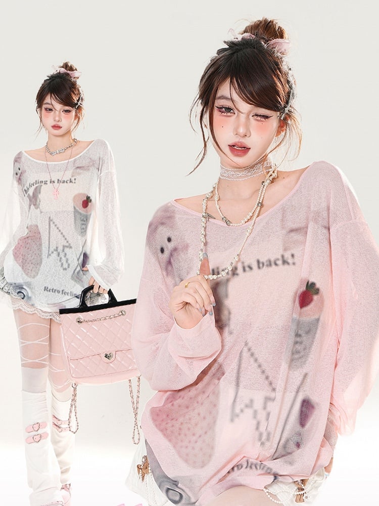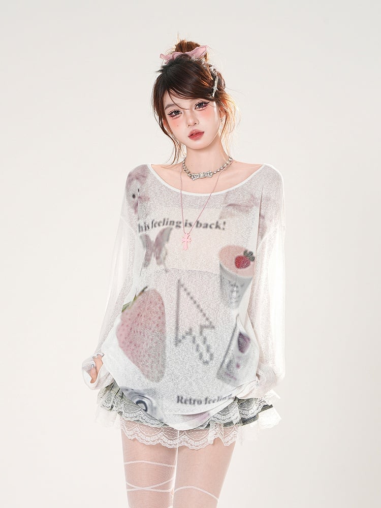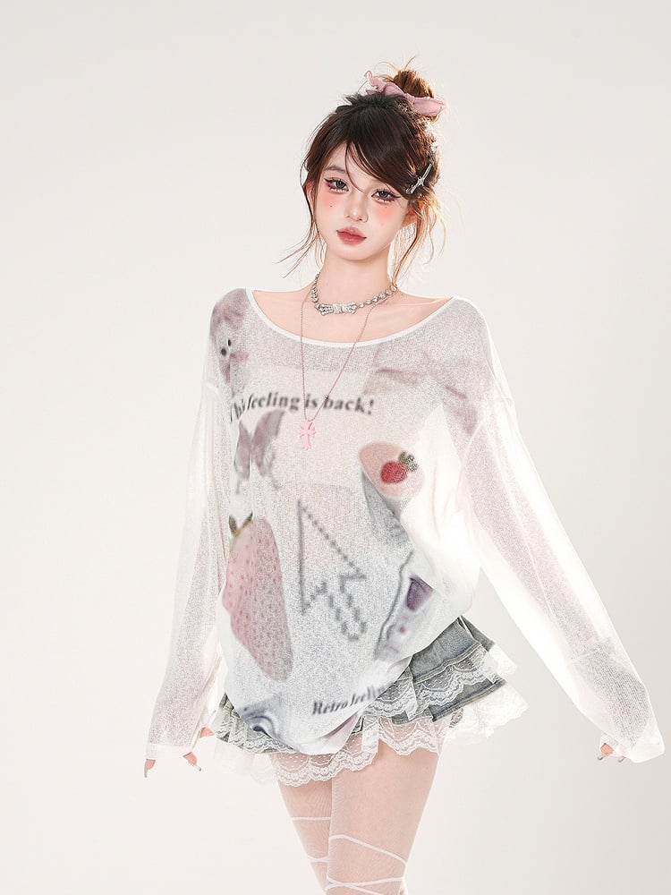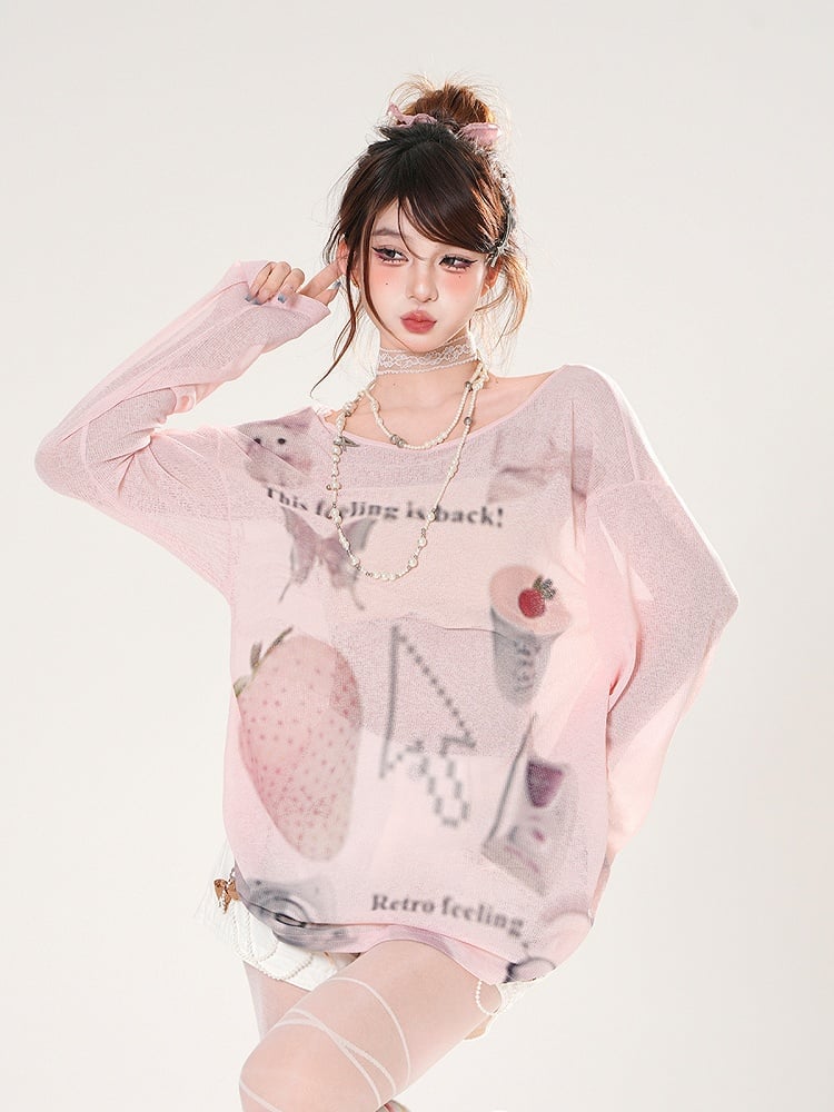 Halbtransparentes Überkleid mit asymmetrischem Ausschnitt und Erdbeerdruck in Weiß/Rosa