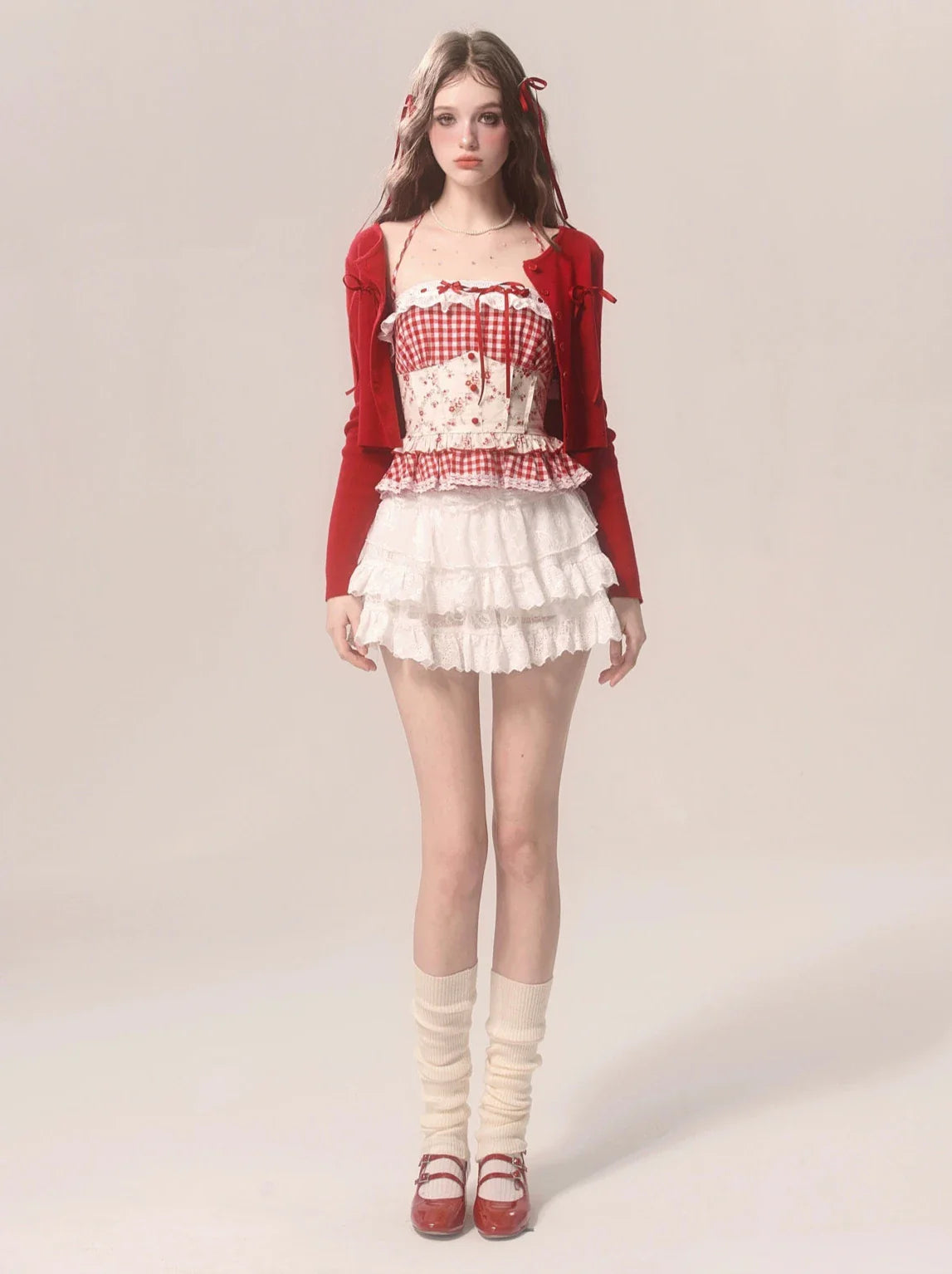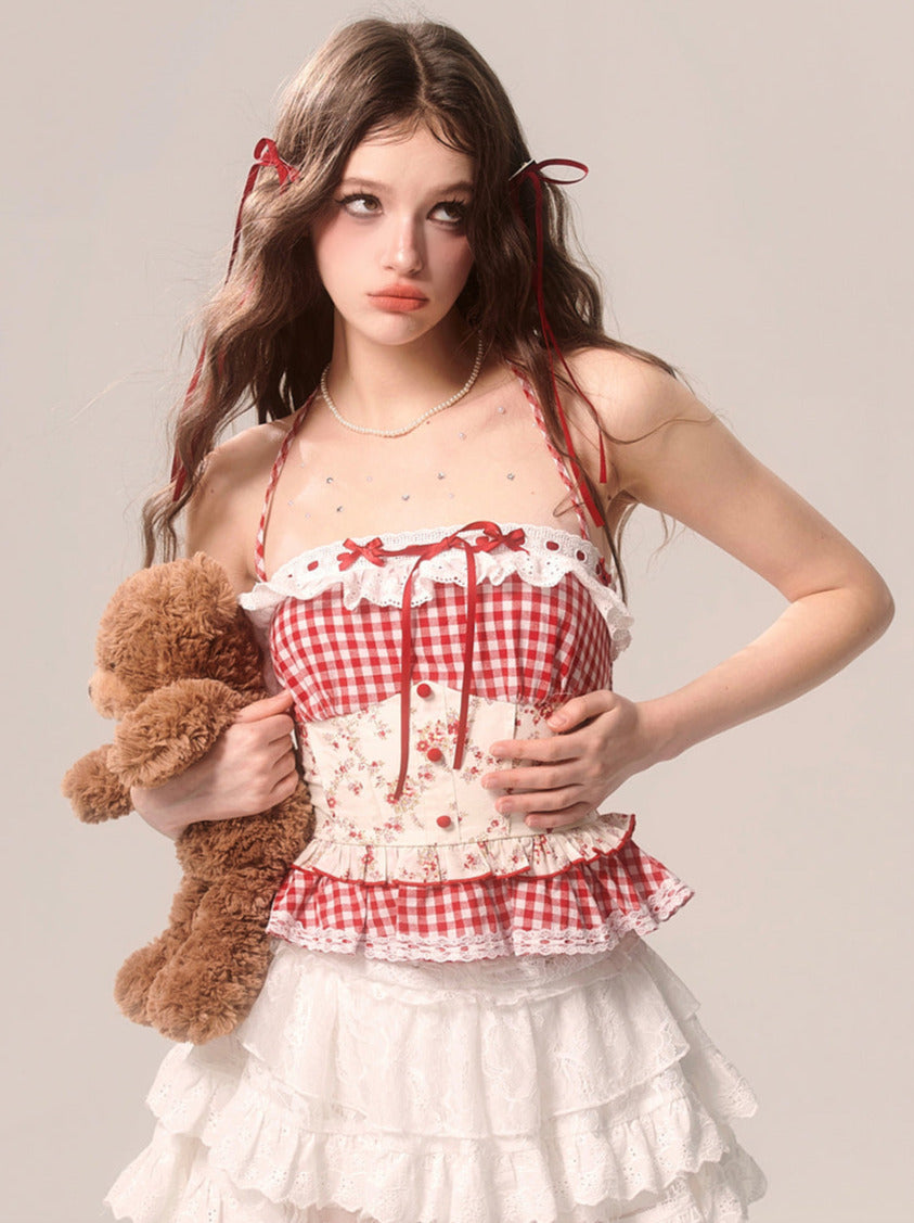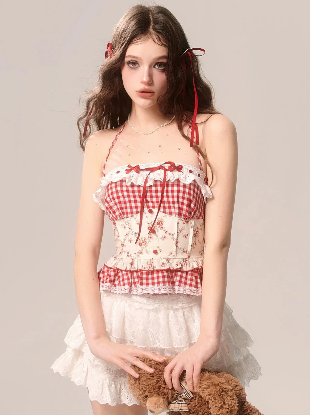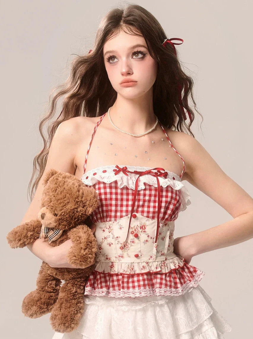 Erdbeer-Top, Neckholder, Kuchen-Hosenträger, kariert, Spitze