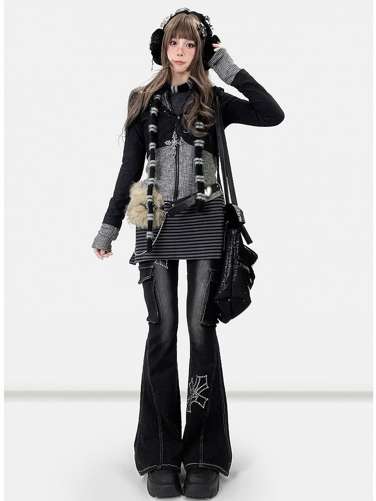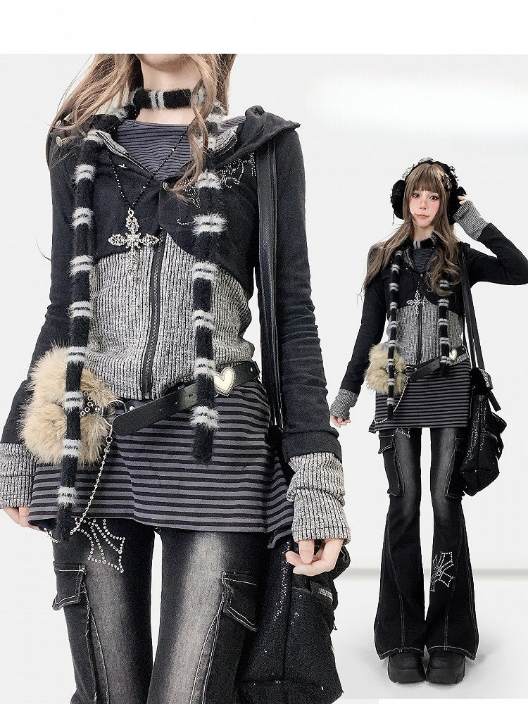 Striped Black Fake Two-Piece Pattern Hoodie Accents Jacket Rhinestone