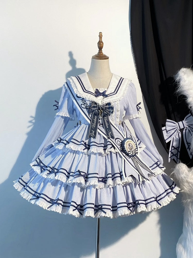 Blau gestreiftes Sommer-Lolita-Kleid mit Matrosenkragen und kurzen Ärmeln