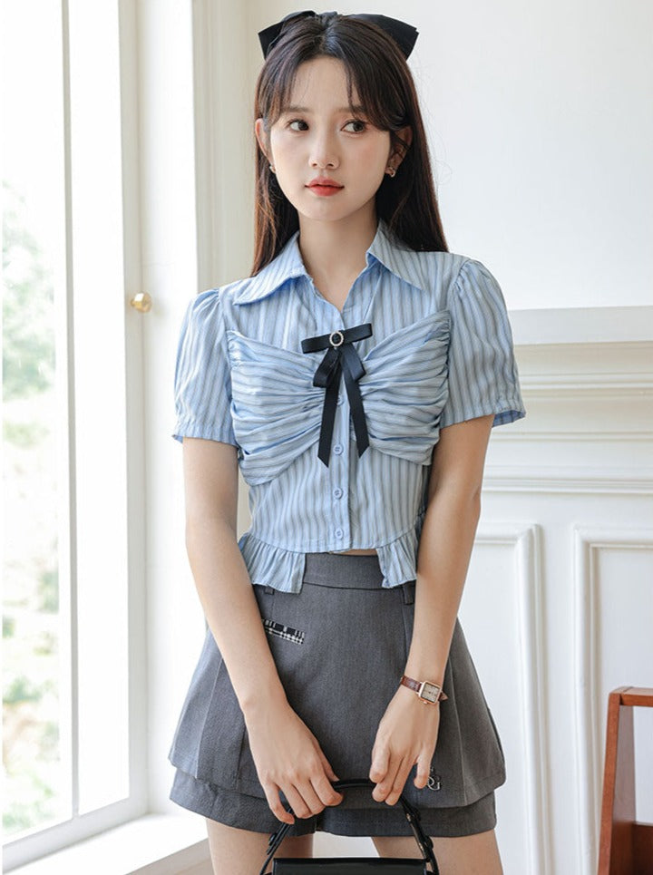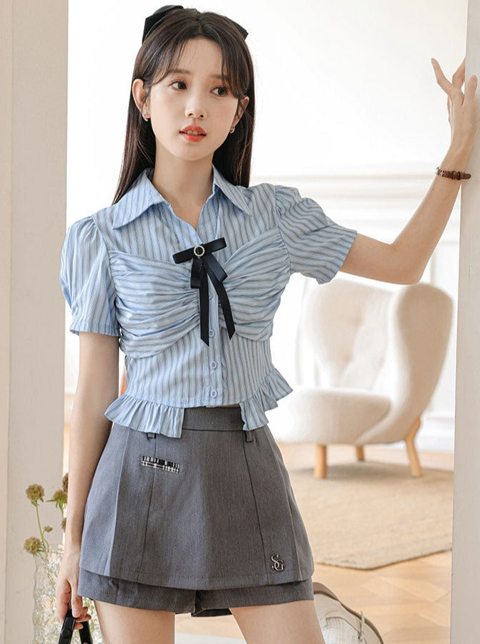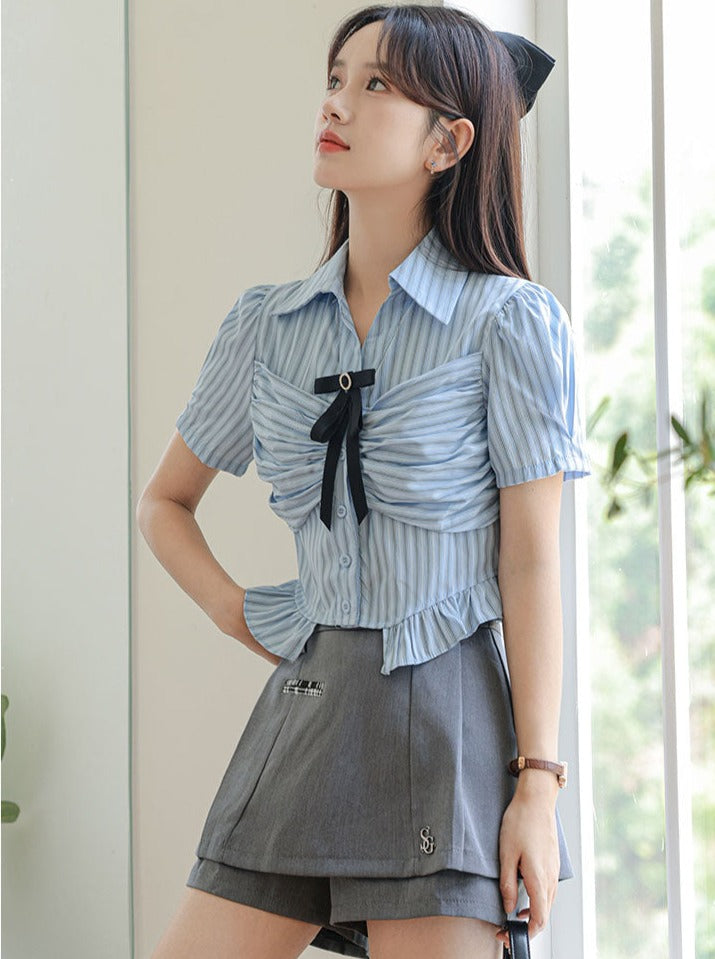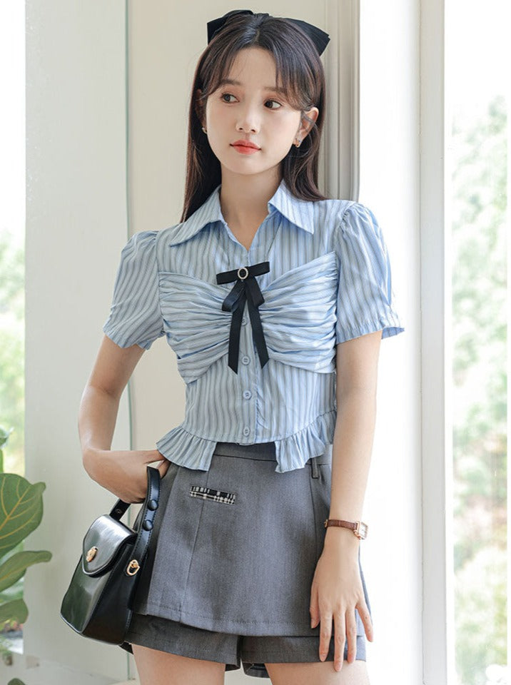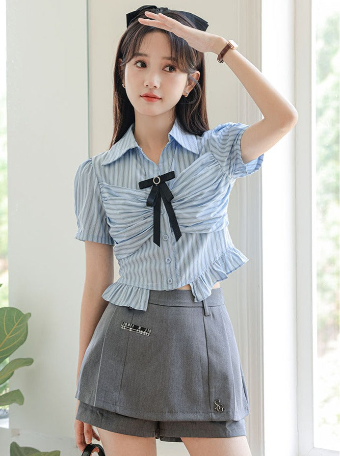 Gestreifter Rock, Shorts, Schleife, blaue Bluse