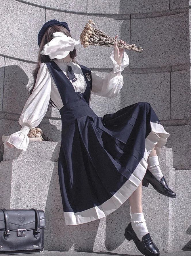 Dieses elegante Kleid- und Blusenset besteht aus einer stilvollen Baskenmütze und Chiffon-Teilen im Retro-Stil, die jedem Outfit eine schicke Note verleihen. Das charmante Emblem und die Rüschendetails wirken niedlich, und die Krawatte betont Ihre Taille für eine schmeichelhafte Silhouette. Perfekt für einen charmanten und süßen Look.