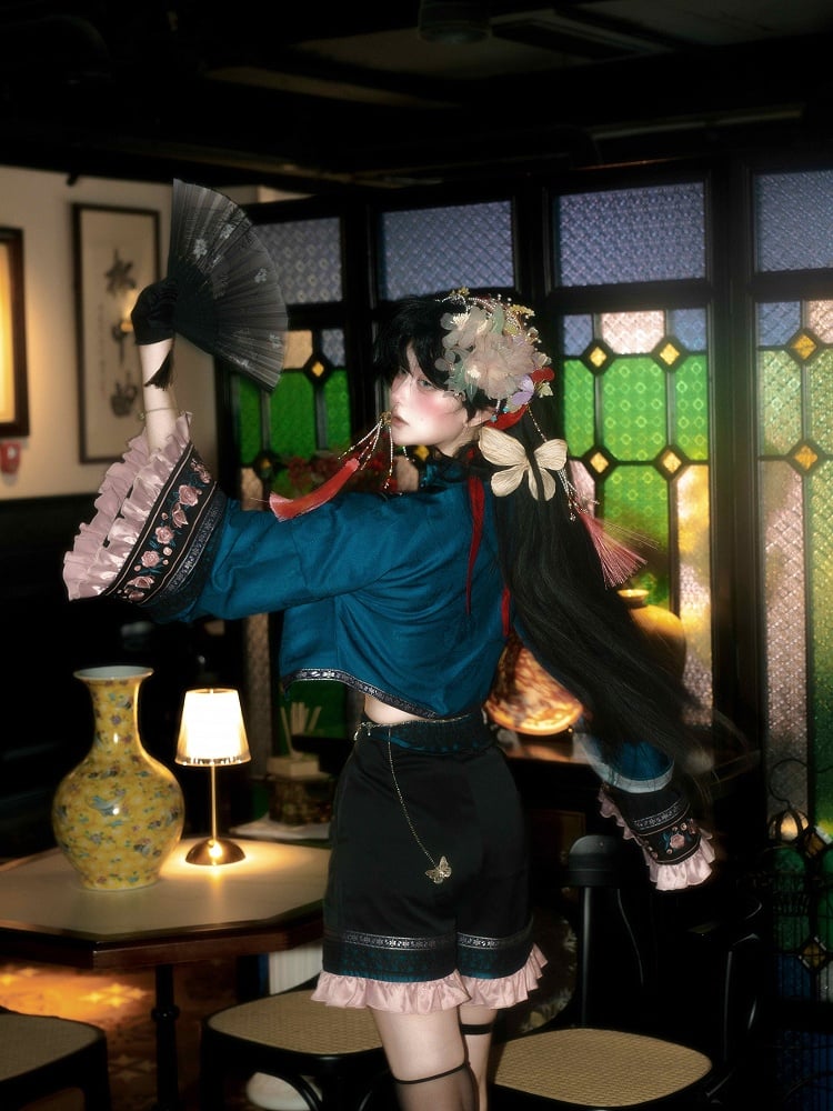 Schwarze Ouji Lolita-Shorts mit Schmetterlings-Hüftkette im Chinoiserie-Stil