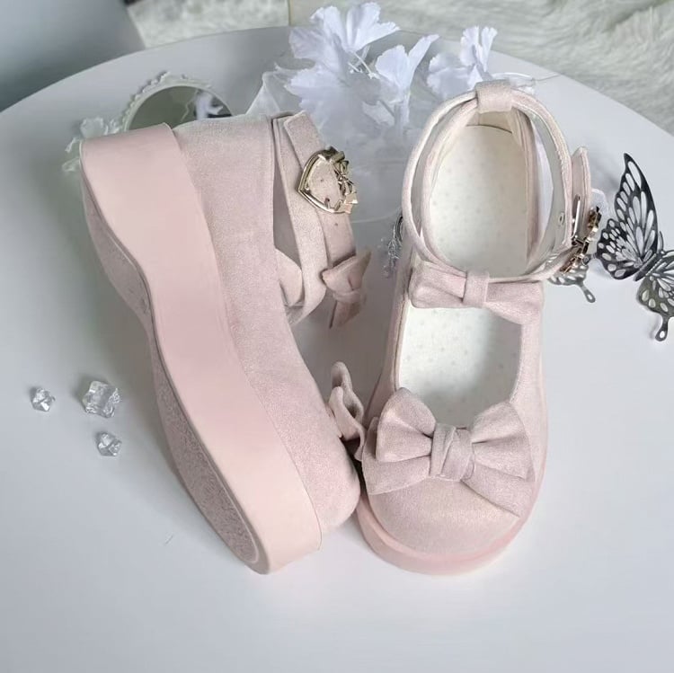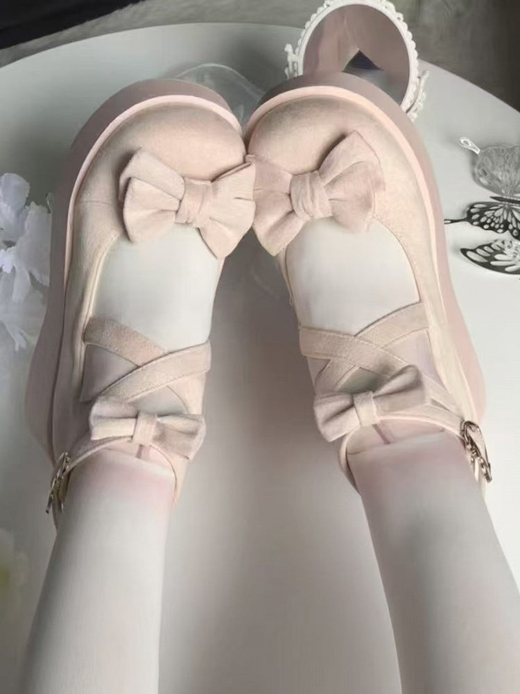 Suede Pink Sweet Lolita Shoes with Snap Design and Bow Details