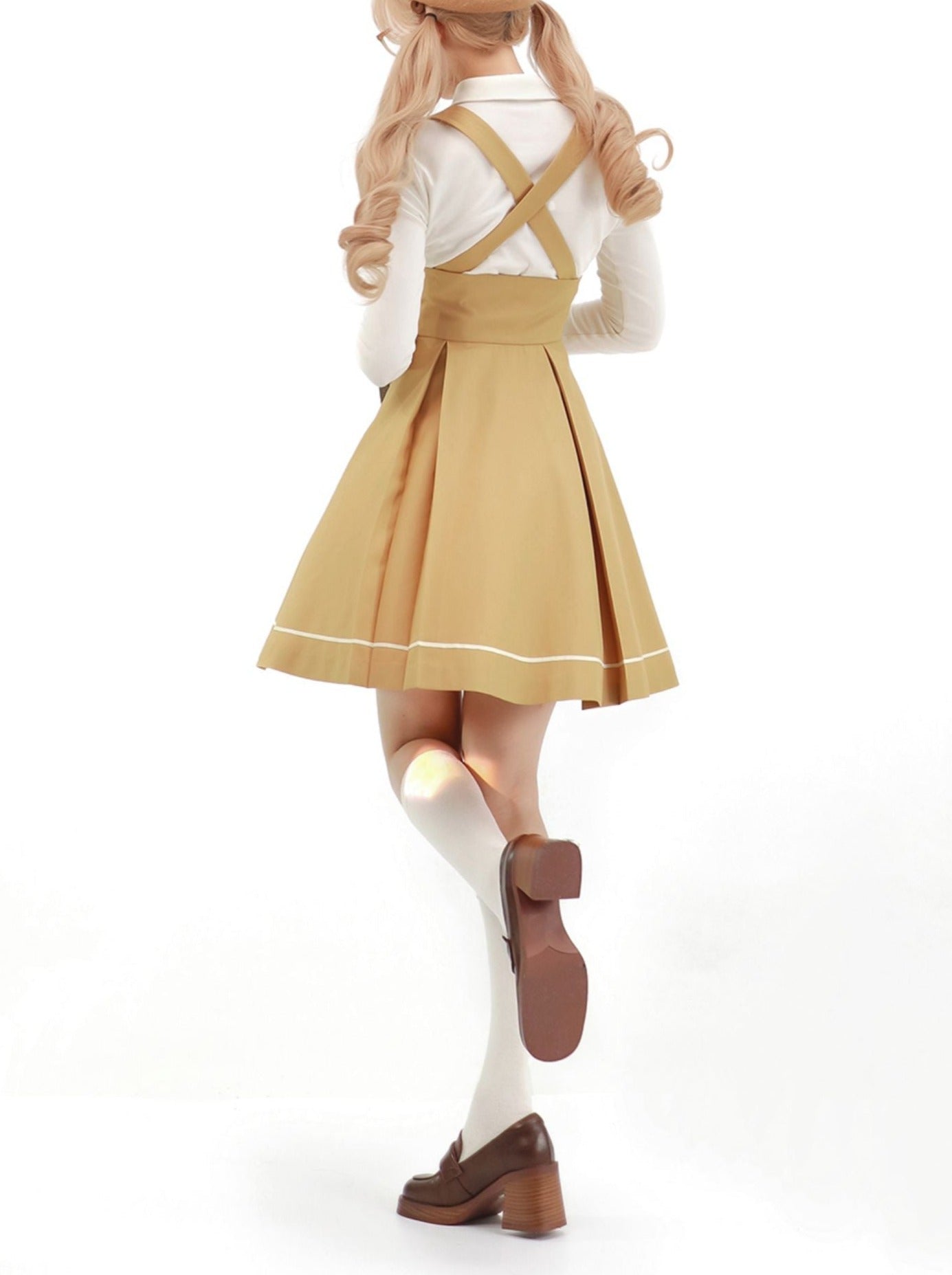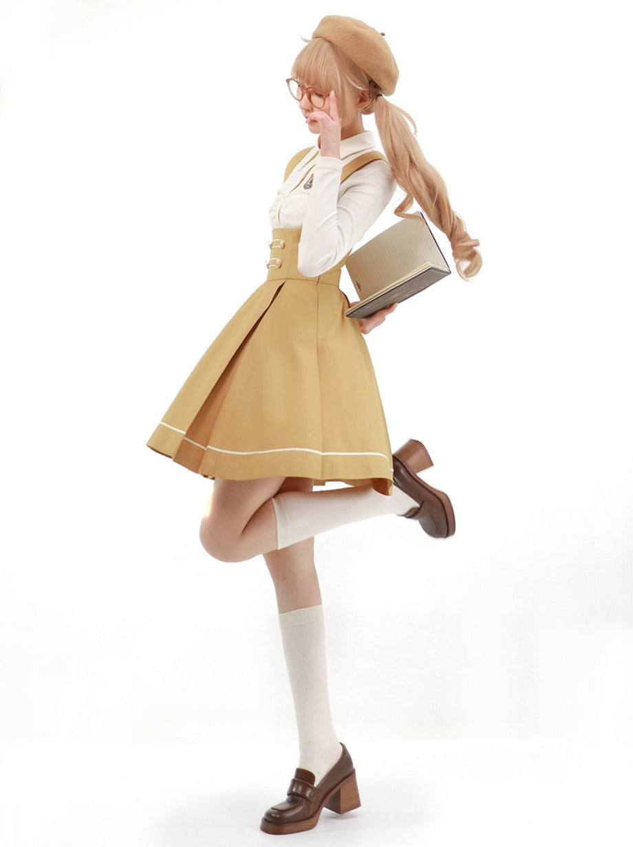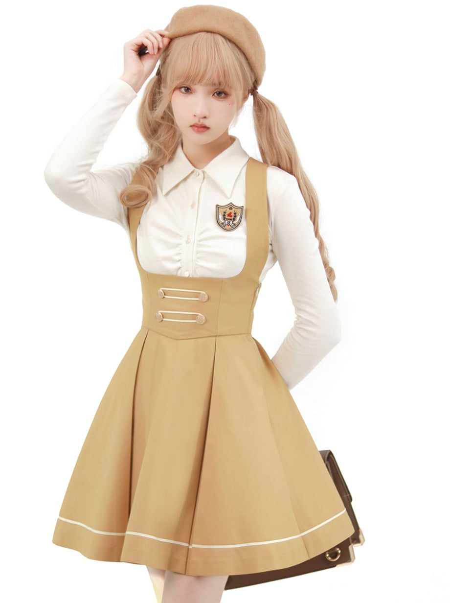 Dieser Rock im College-Stil mit Hosenträgerabzeichen und Bluse ist perfekt für einen süßen und stylischen Look. Bequem und vielseitig, sorgt dieses Outfit dafür, dass Sie den ganzen Tag über bezaubernd aussehen. Kombinieren Sie es einfach mit anderen Teilen für endlose Outfit-Optionen.