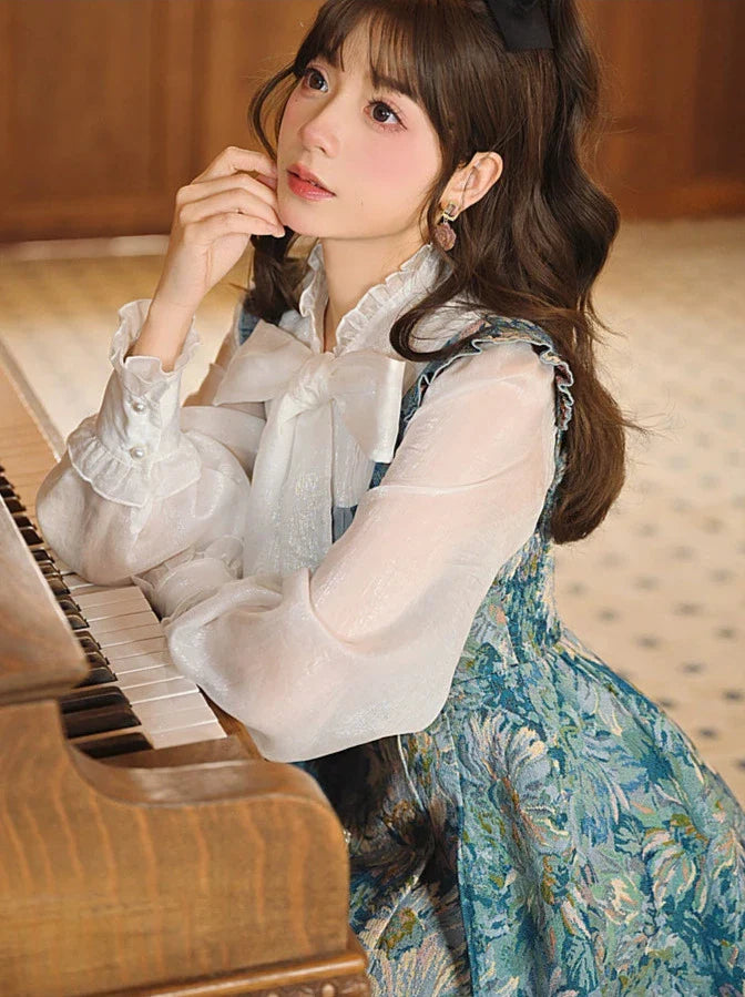 Dieses bezaubernde Kleiderensemble besteht aus einer verspielten Schleifenbluse, einem Chiffon-Rüschenrock und einem Hosenträger-inspirierten Design. Verschönern Sie die Stadt mit diesem charmanten, vom Wald inspirierten Stil und runden Sie den Look mühelos mit der mitgelieferten Krawatte ab.