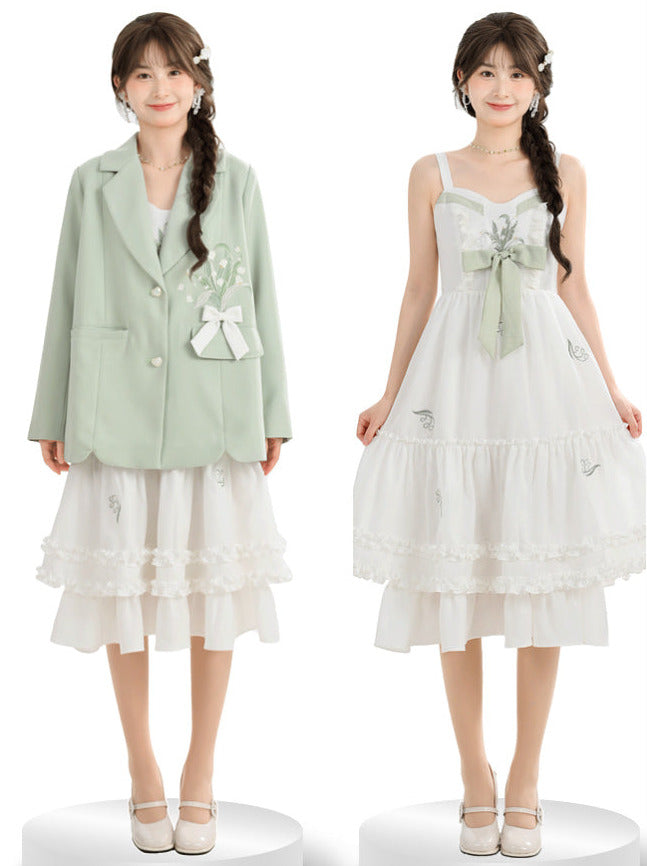 Dieses bezaubernde Anzug- und Kleiderset besteht aus einem mintgrünen Hosenträger, einer geblümten Jacke und einem Rüschenkleid mit Schleife. Perfekt, um jedem besonderen Anlass einen Hauch von Niedlichkeit zu verleihen.