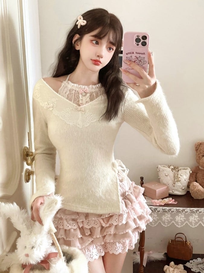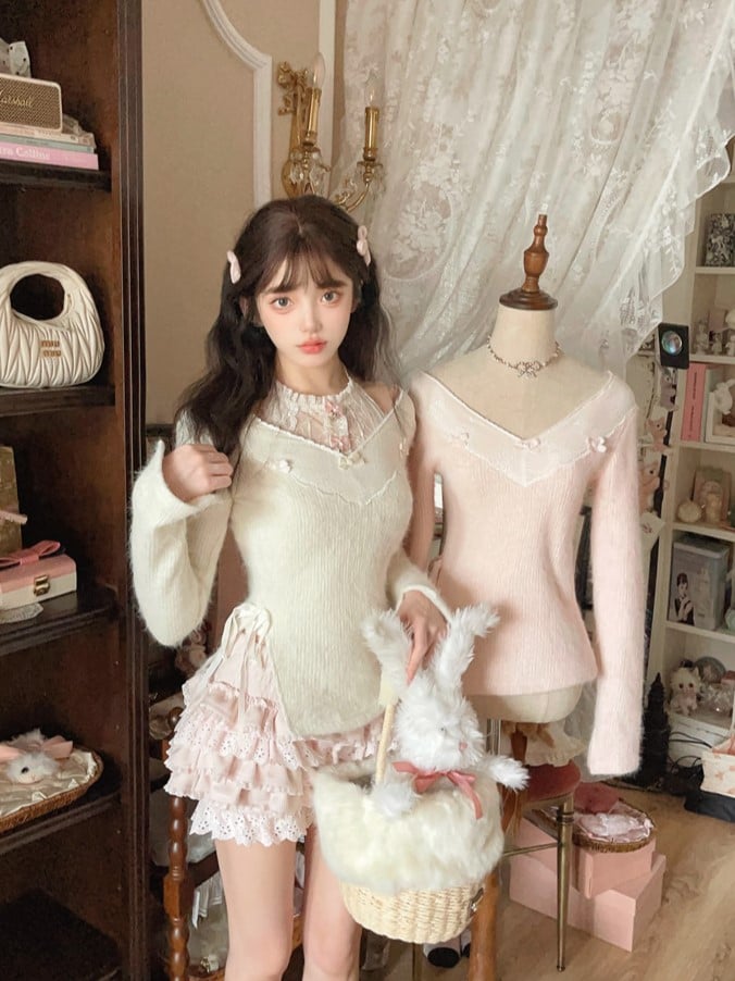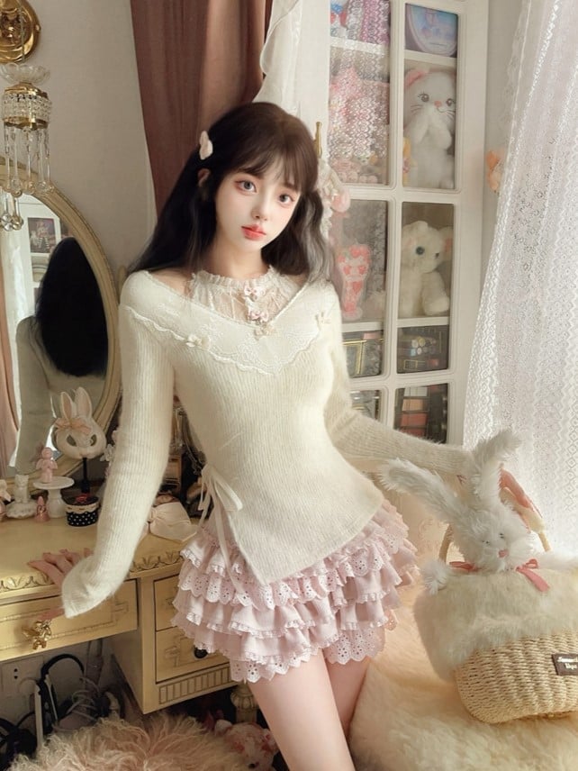 Pullover mit Schleifenakzenten und verspieltem Banddetail, weißer Strick mit Spitzenbesatz und V-Ausschnitt