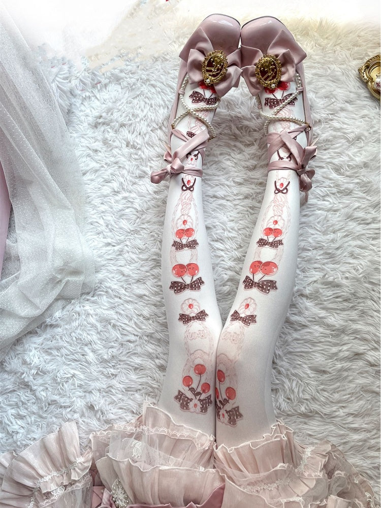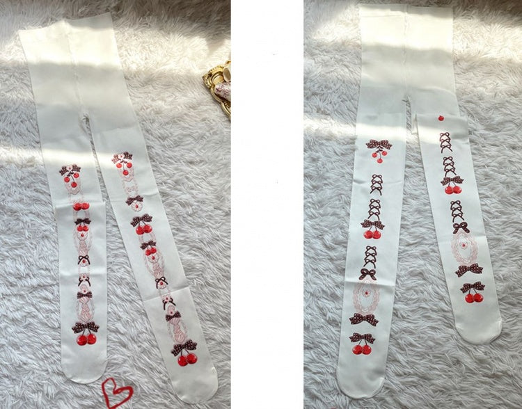 Bezaubernde Schleifen und kirschweiße Strumpfhosen verleihen jedem Outfit eine schöne Note. Mit zarten Schleifenakzenten und einem bezaubernden Kirschmuster verleihen diese Strumpfhosen Ihrem Look eine süße und verspielte Note. Perfekt, um Ihrem Tag einen Hauch von Süße zu verleihen.