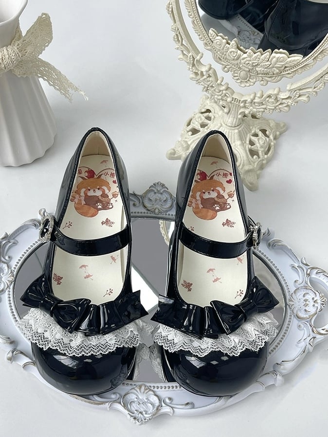Süße schwarze Lolita-Low Heels – PU-Leder mit runder Spitze, zarter Spitze und Schleifendetails