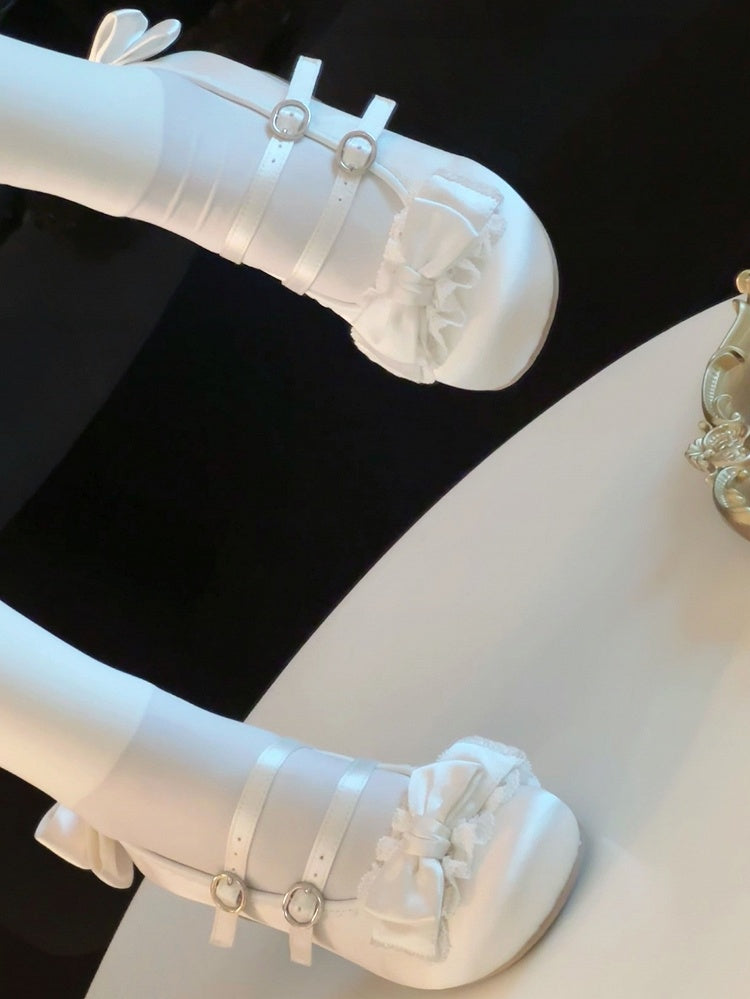 Weiße Sweet Lolita Mary Janes aus satiniertem PU – gerüschte Spitze mit Schleife und Doppelschnallen