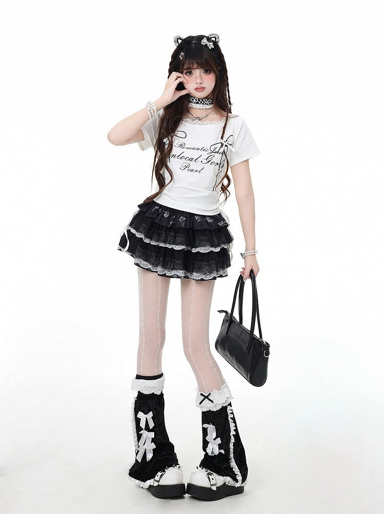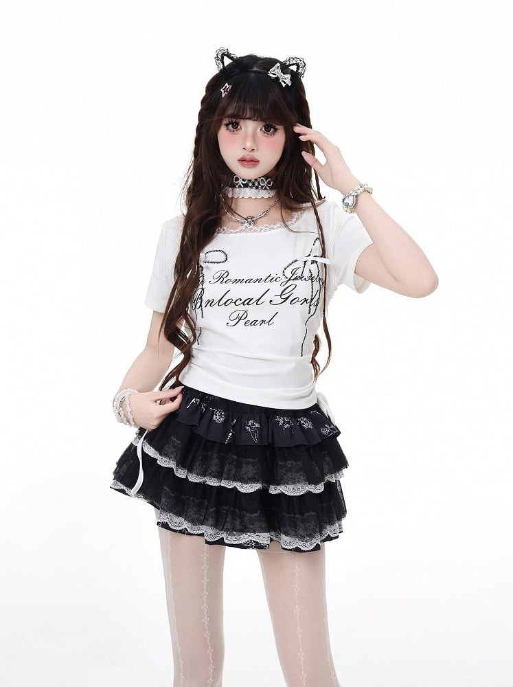 T-Shirt Grafik Schwarz/Grau/Weiß Details Kordelzug Taille Spitzenbesatz Schleife