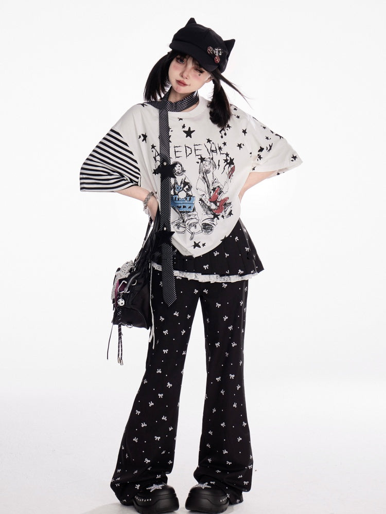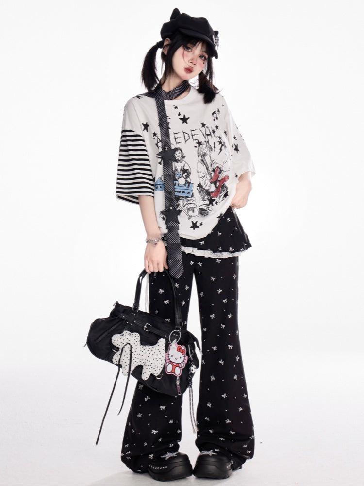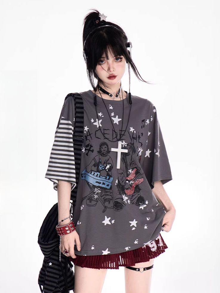 T-Shirt Loose Y2K Graffiti Print Rundhals Grau/Weiß