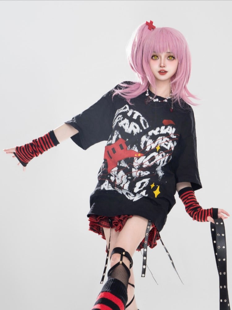 Schwarzes Punk-T-Shirt mit rotem Bass und weißem Graffiti-Print