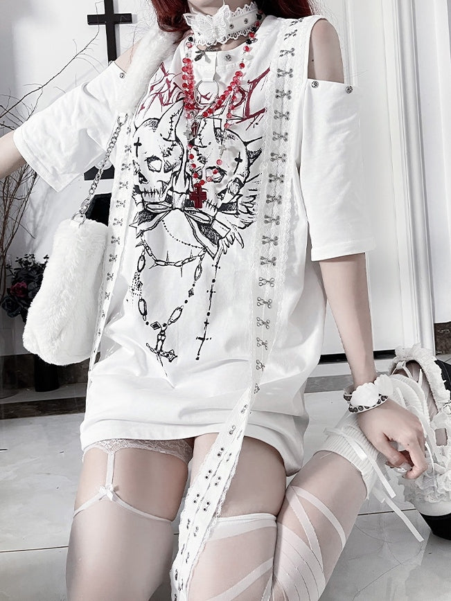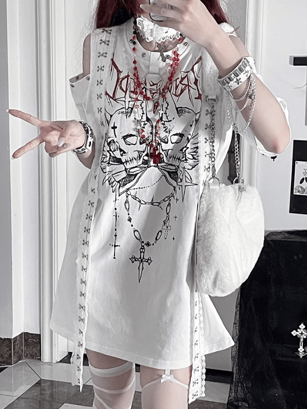 T-Shirt Weiß Cutout Schulter Design Punk Emo