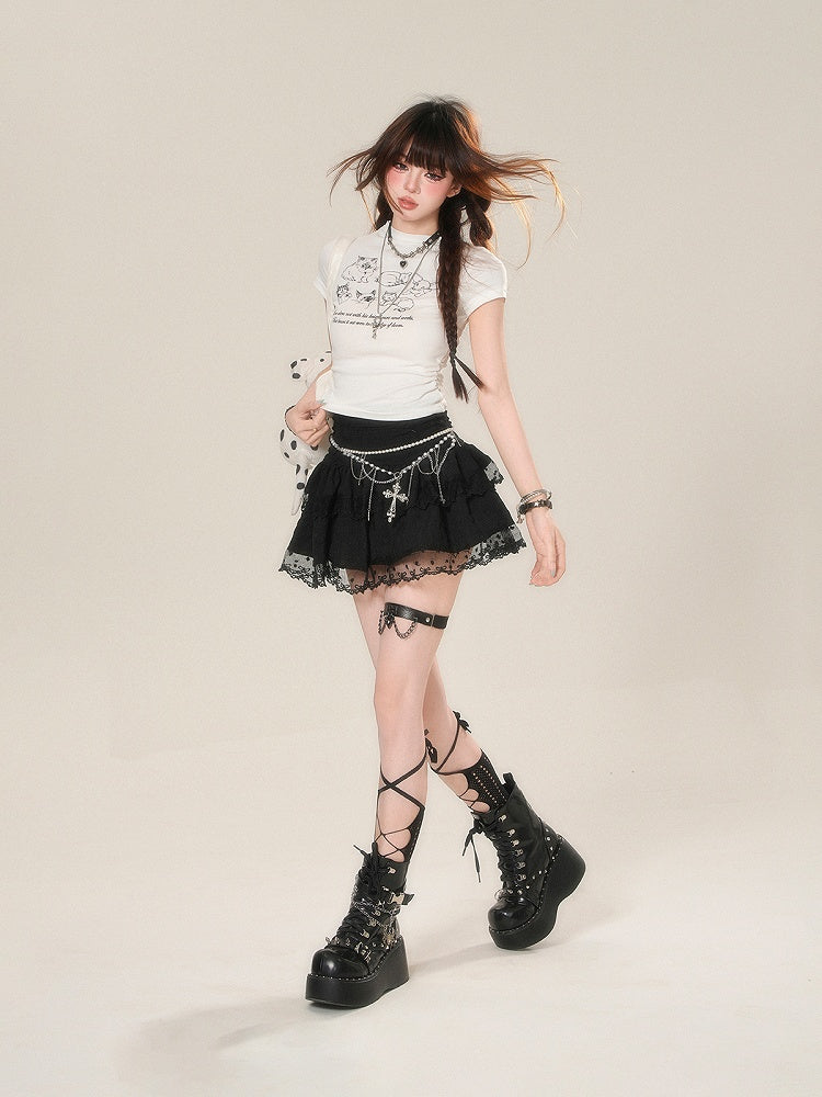 Glamouröses, schmal geschnittenes T-Shirt mit weißem Kitty-Print