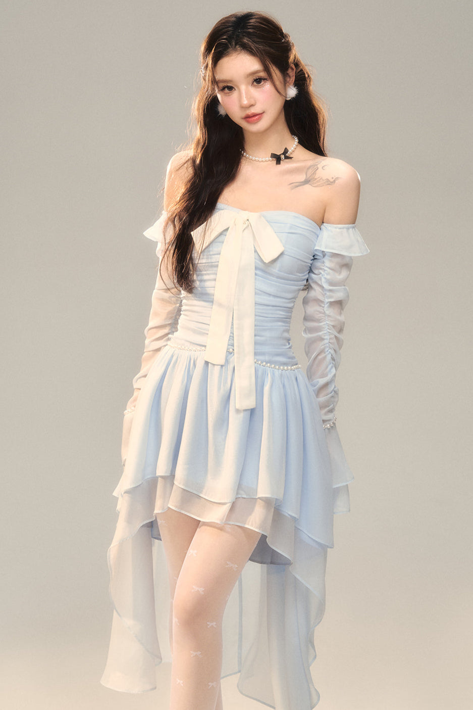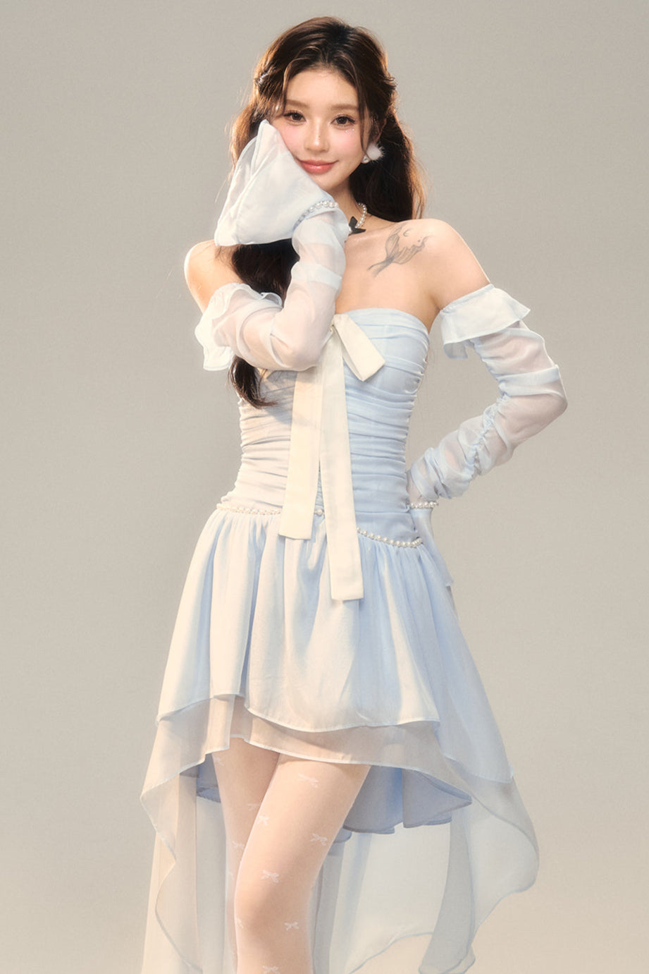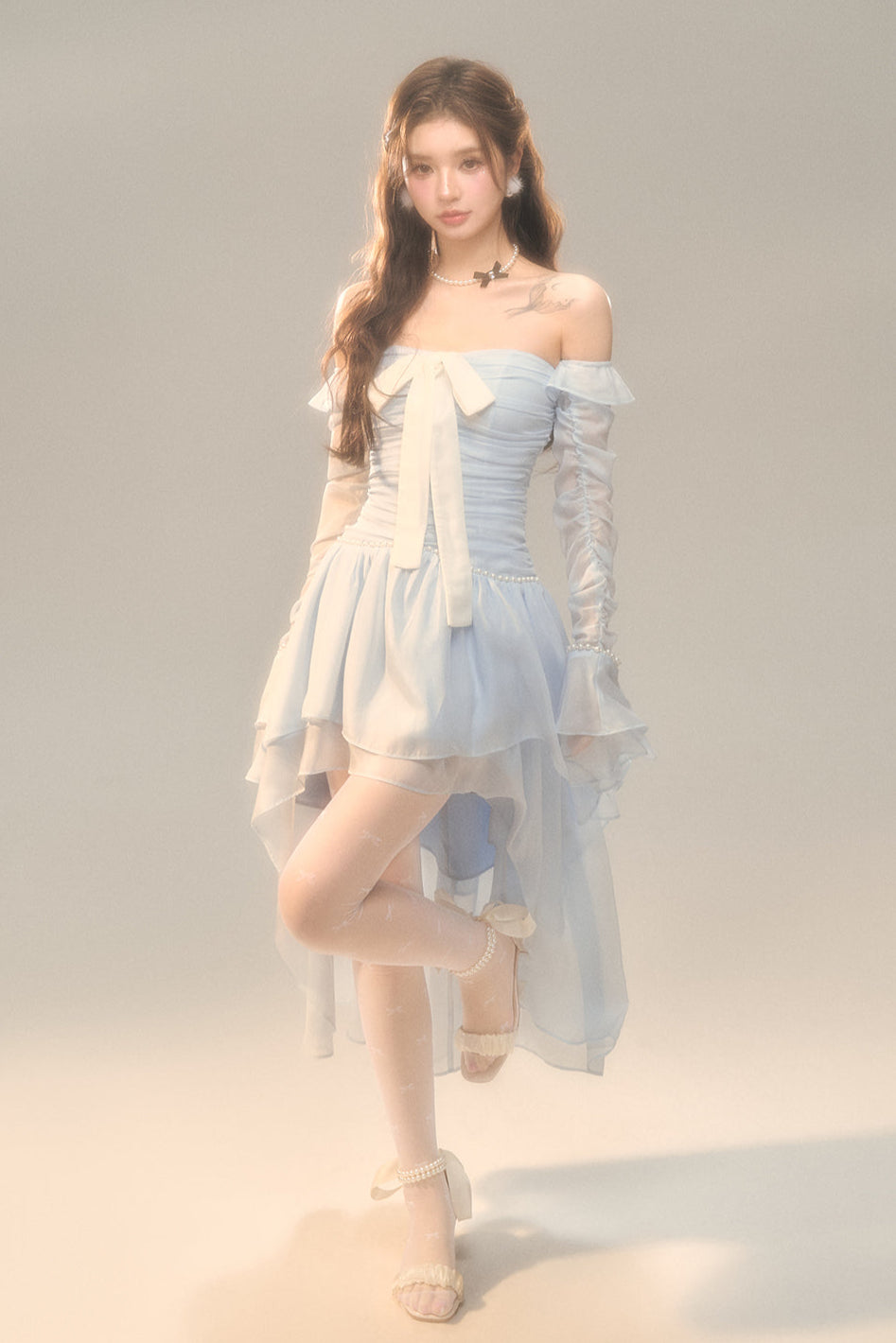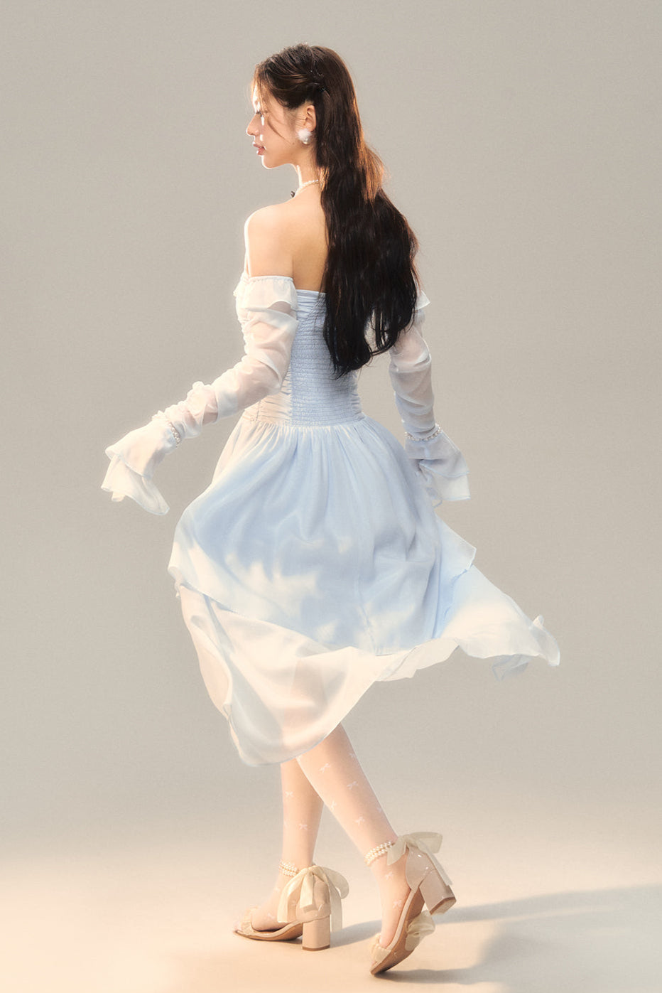 Blau-weißes Old School Lolita Fashion Kleid mit Schleife und Details, JSK-Set