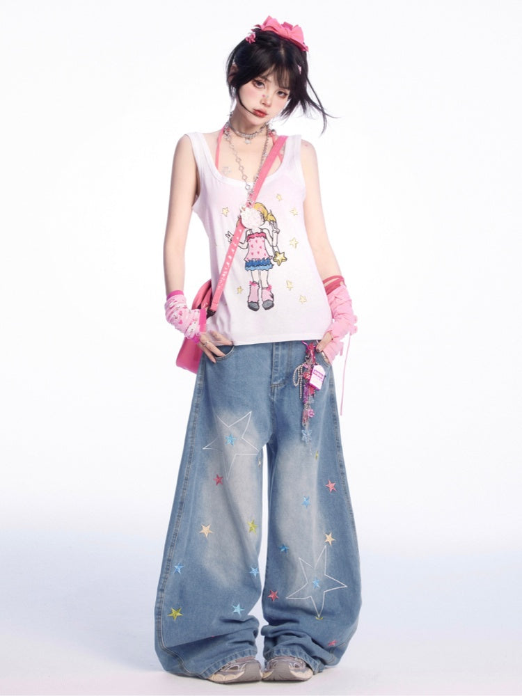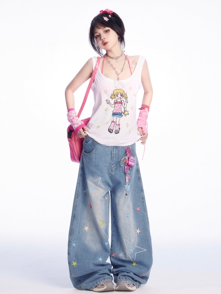 Weißes lockeres Tanktop mit Manga-Mädchen-Print