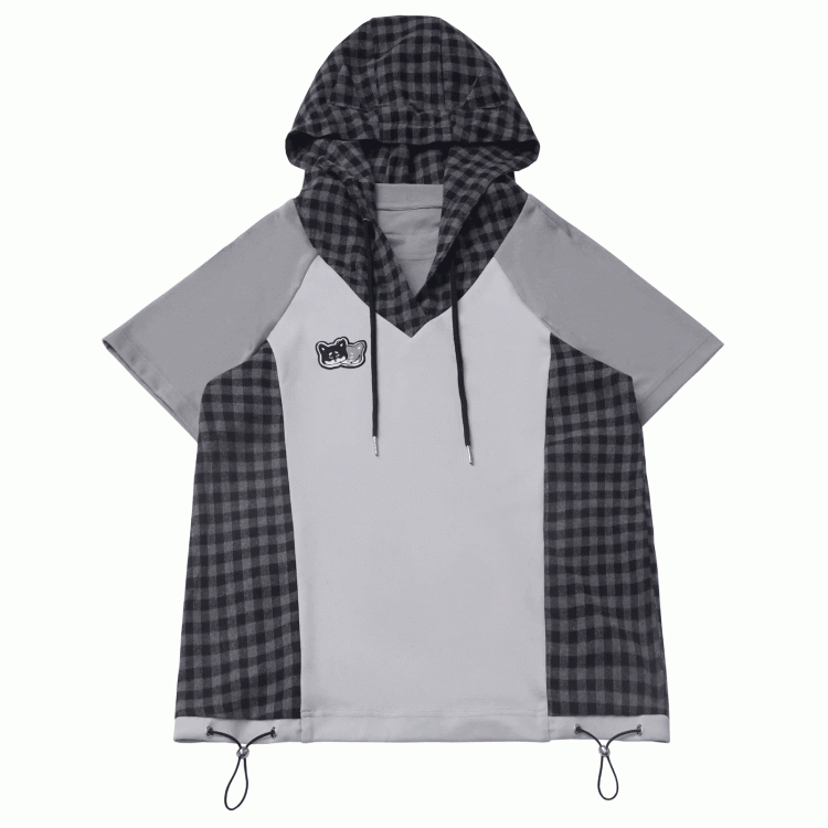 Techwear T-Shirt Plaid Patchwork Design Wolf Stickerei Wolf Ohren Kapuze Grau
