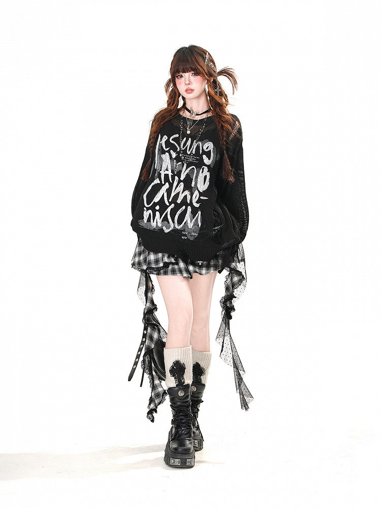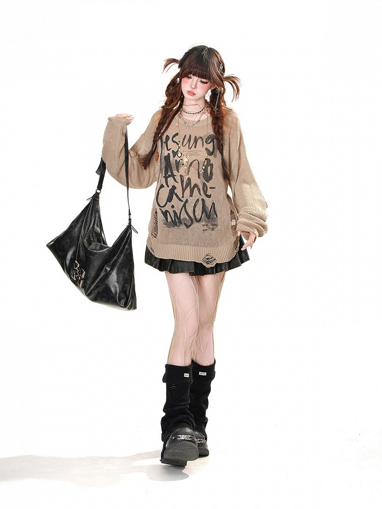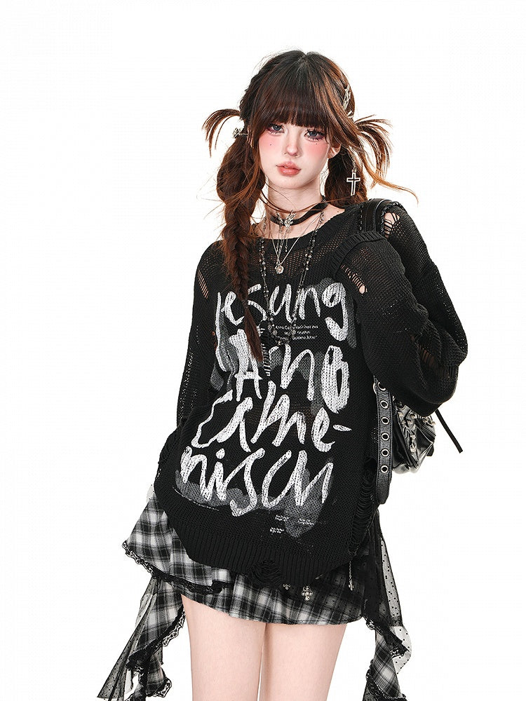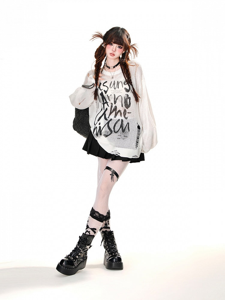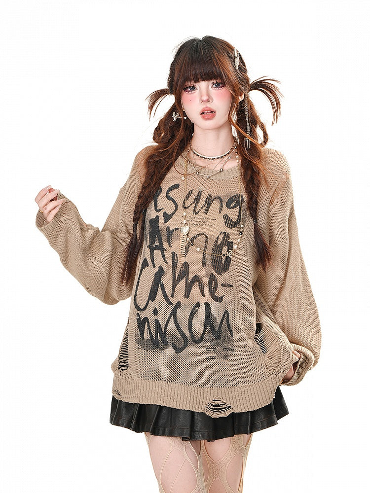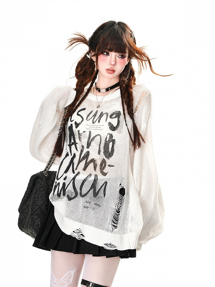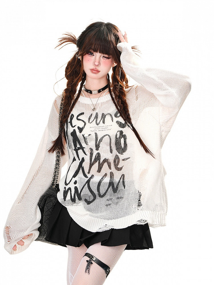 Weiß/Braun/Schwarzes Oberteil mit Buchstabendruck und Löchern im Used-Look, Sonnenschutz für den Sommer, ausgehöhlt