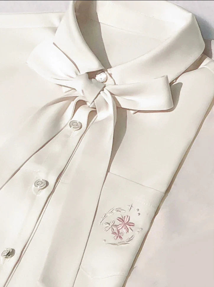 Trenchcoat in Schwarz + College-Abzeichen aus Metall + Hemd mit Plissee und besticktem Mantelband