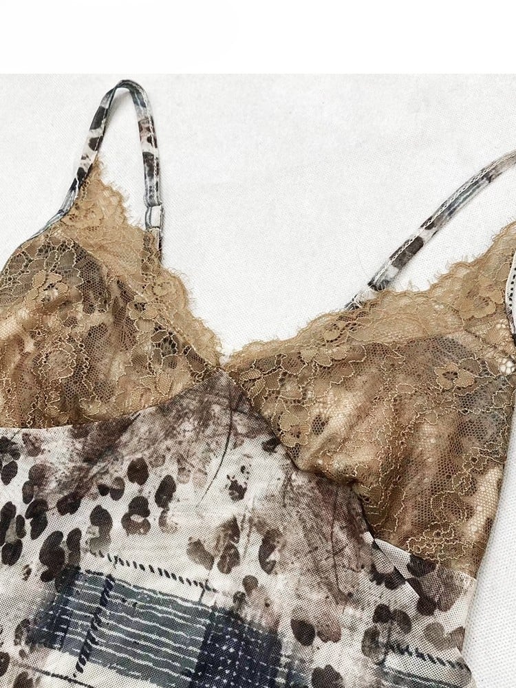 Braunes Y2K-Camisole-Top mit Leopardenmuster und kontrastierenden Spitzenpatches + Spitzenbesatz, V-Ausschnitt