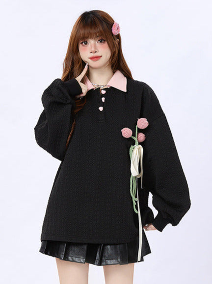Dieses bezaubernde Polo-Sweatshirt mit Tulpenkragen verleiht jedem Outfit einen Hauch von Niedlichkeit. Das Tulpenkragen-Design ist einzigartig und stilvoll zugleich, während das Sweatshirt-Material für Komfort und Wärme sorgt. Perfekt für einen gemütlichen Tag.