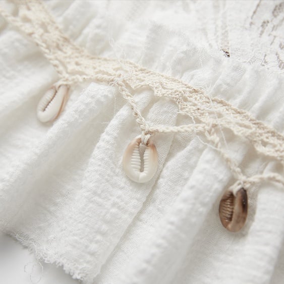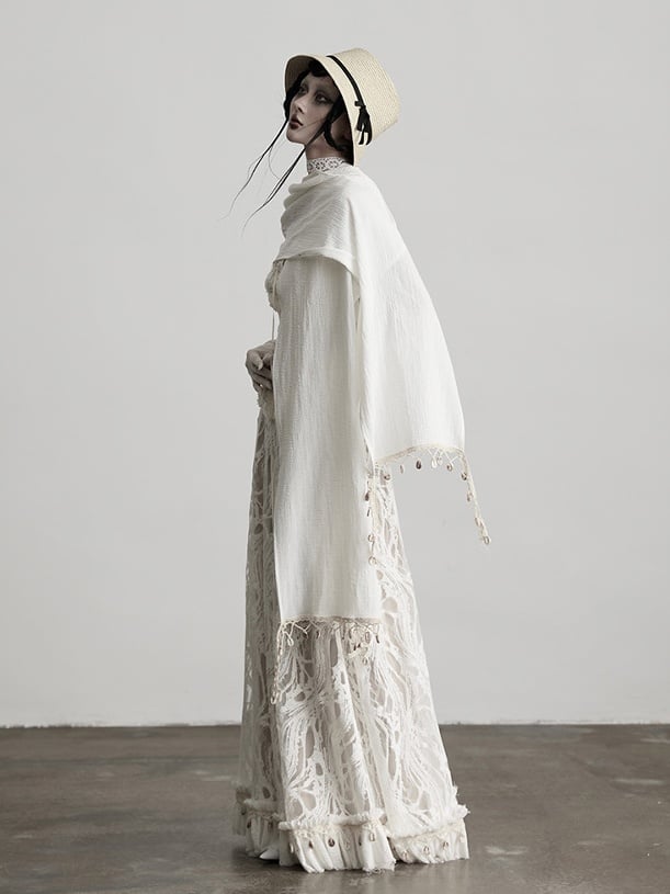 Urban Goth White Floral Pattern Tulle Umbrella Skirt with Shell Charms + White Shawl