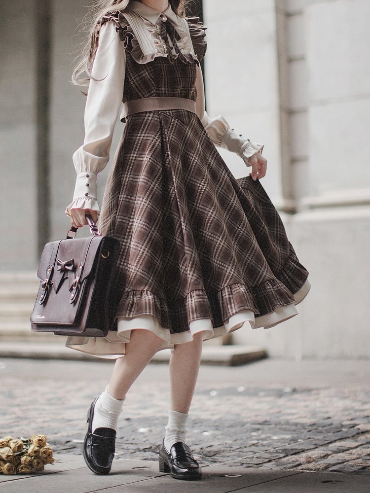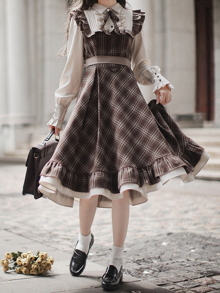 Braunes Kleid mit Karomuster und Gürtel, Fake-Zweiteiler