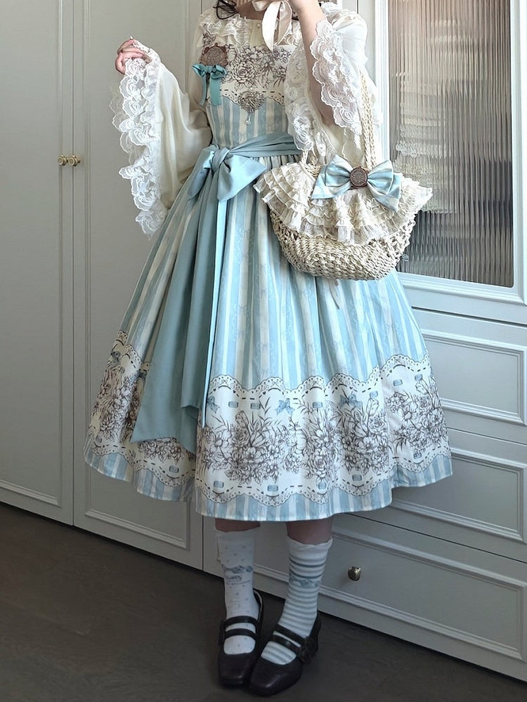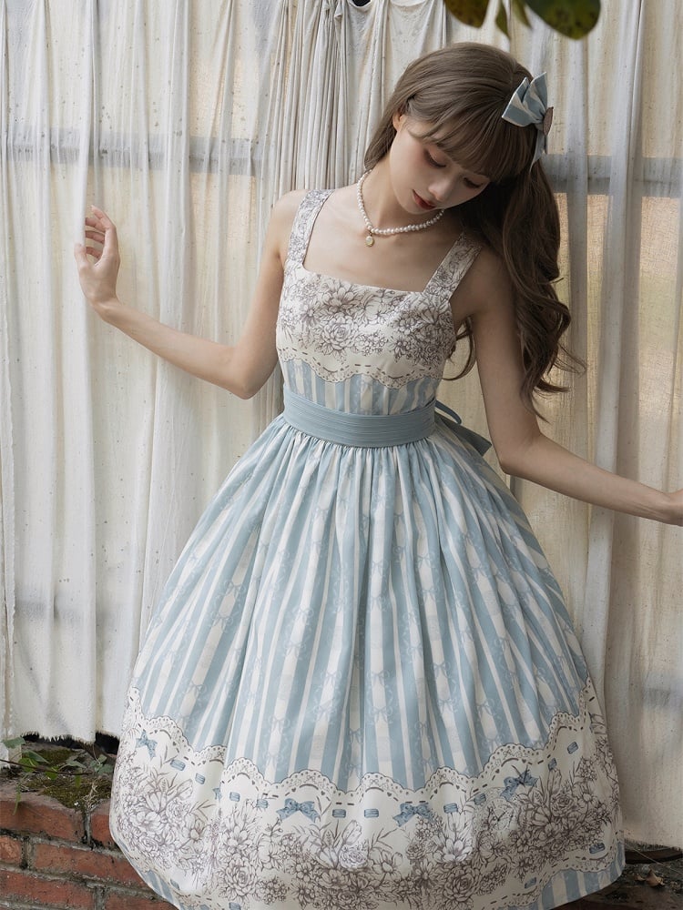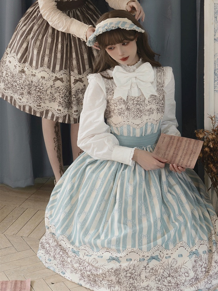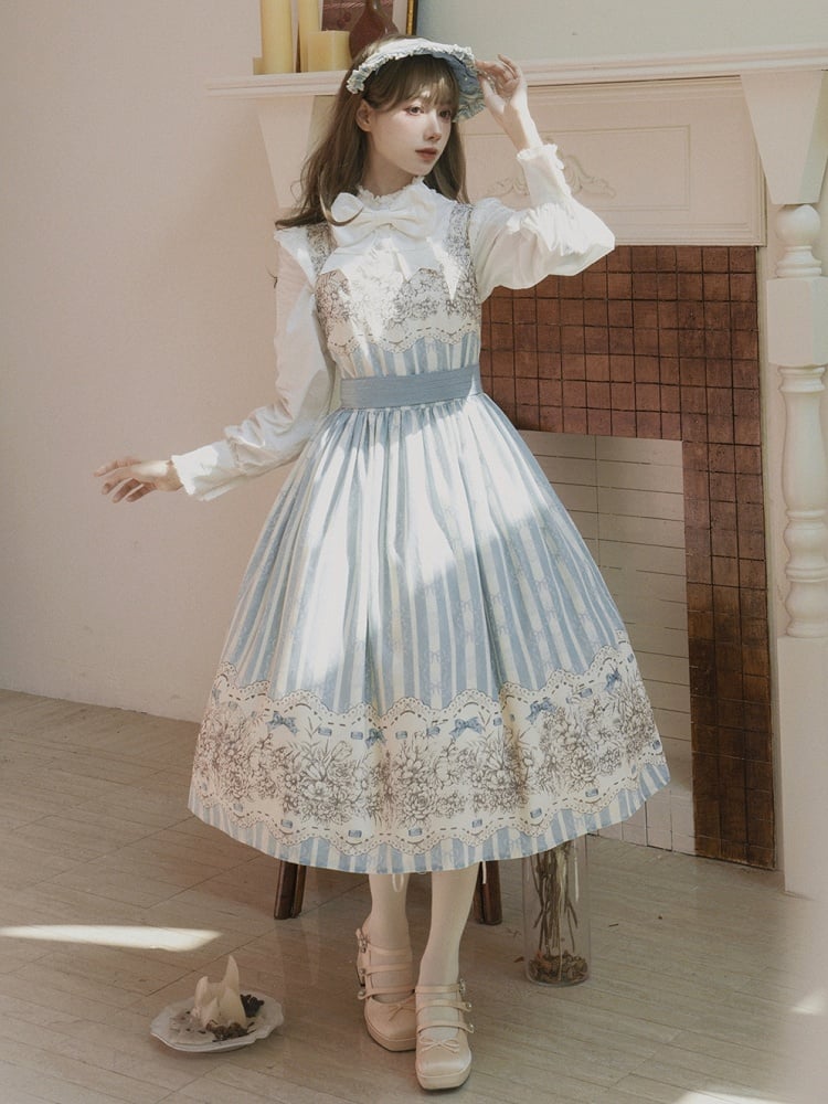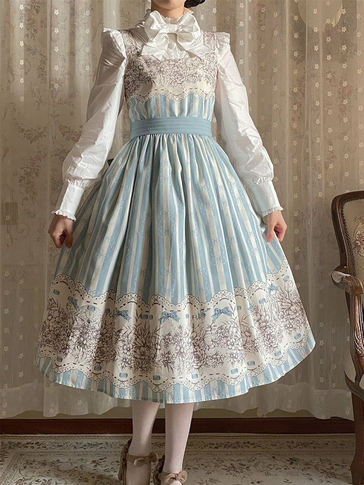 Long Version Blue Floral and Clock Print Classic Lolita Jumper Skirt