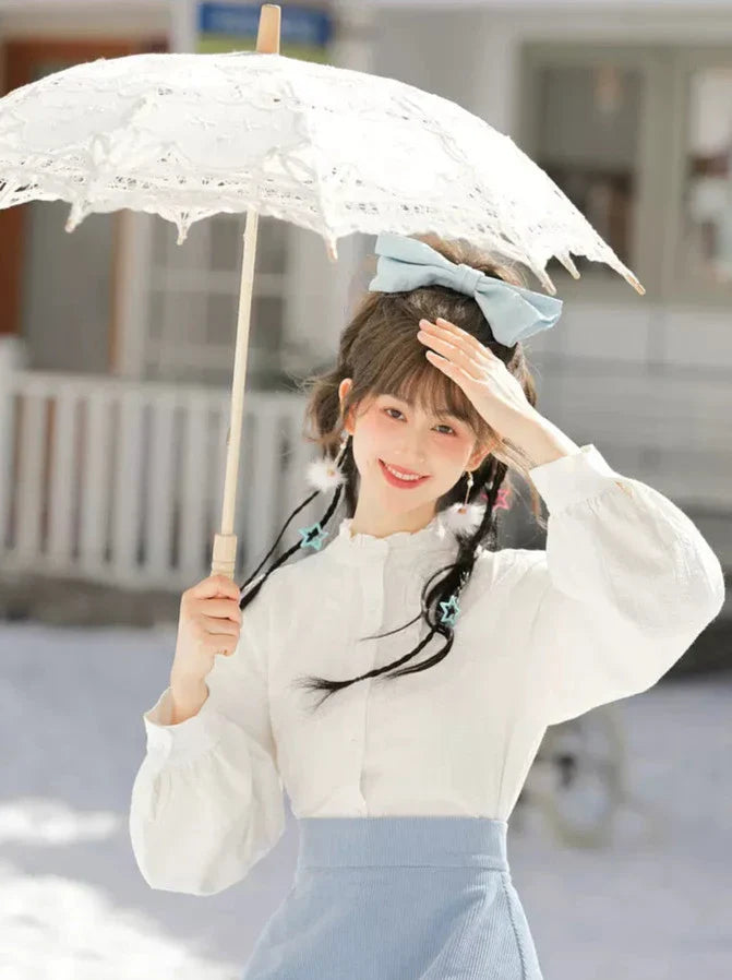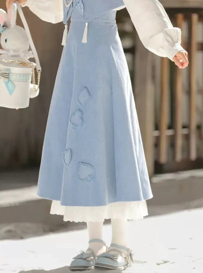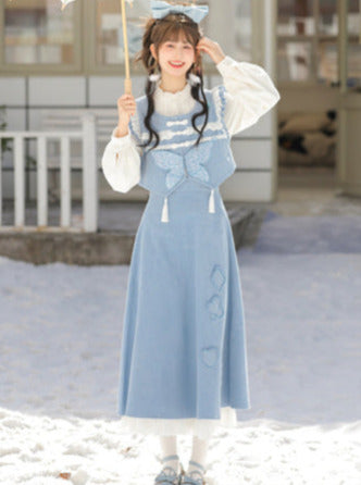 Blau-weißes Old School Lolita Fashion Kleid mit Schleife und Details, JSK-Set