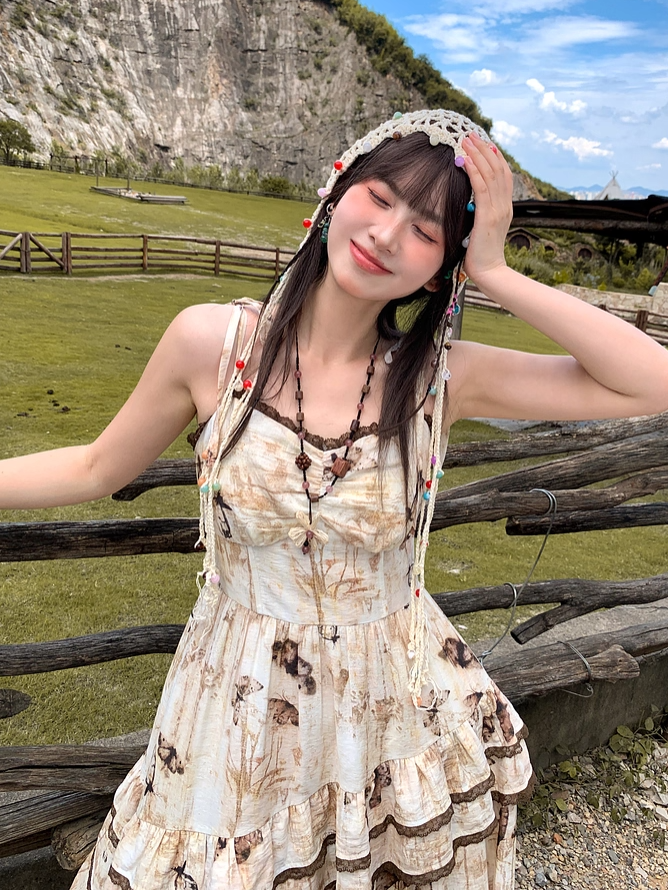 Vintage Schmetterlingsdruck Taschentuch Saum Apricot Tie Dye Spaghettiträger Kleid