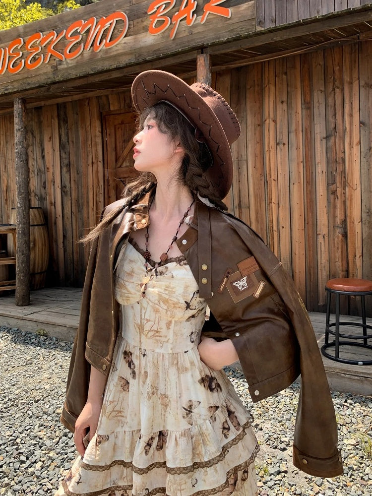 Vintage Schmetterlingsdruck Taschentuch Saum Farbstoff Apricot Krawatte Spaghettiträger Kleid